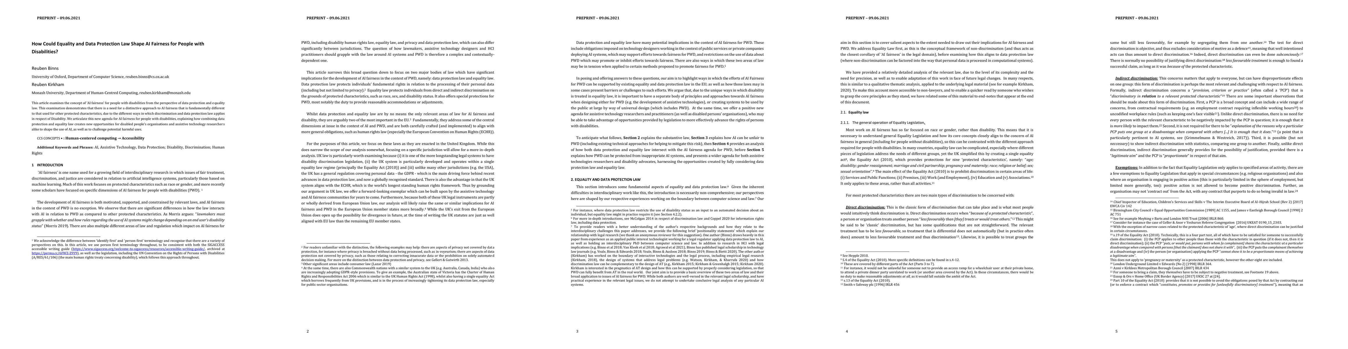 This article examines the concept of 'AI fairness' for people with disabilities from the perspective of data protection and equality law. This examination demonstrates that there is a need for a distinctive approach to AI fairness that is fundamentally different to that used for other protected characteristics, due to the different ways in which discrimination and data protection law applies in respect of Disability. We articulate this new agenda for AI fairness for people with disabilities, explaining how combining data protection and equality law creates new opportunities for disabled people's organisations and assistive technology researchers alike to shape the use of AI, as well as to challenge potential harmful uses.