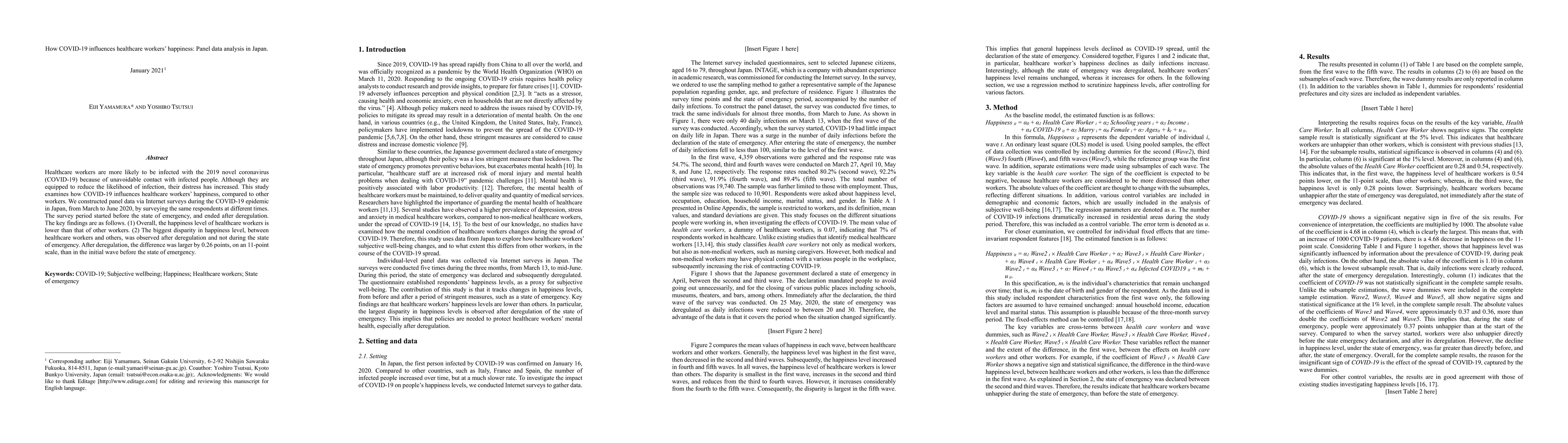 This study investigates the impact of COVID-19 on the happiness of healthcare workers in Japan using panel data from Internet surveys conducted from March to June 2020. The findings show that healthcare workers consistently report lower happiness levels compared to other workers, with the greatest disparity observed post-deregulation.