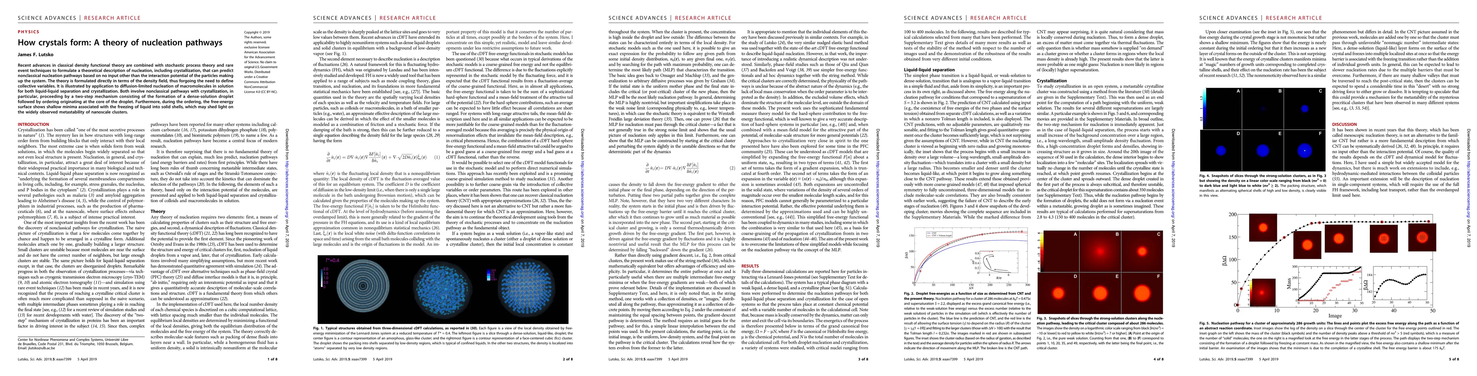 This paper develops a theoretical framework using classical density functional theory and stochastic processes to predict nucleation pathways, particularly for crystallization, revealing a two-step mechanism involving dense-solution droplet formation followed by core-driven ordering. The approach does not require collective variables and explains the metastability of nanoscale clusters.