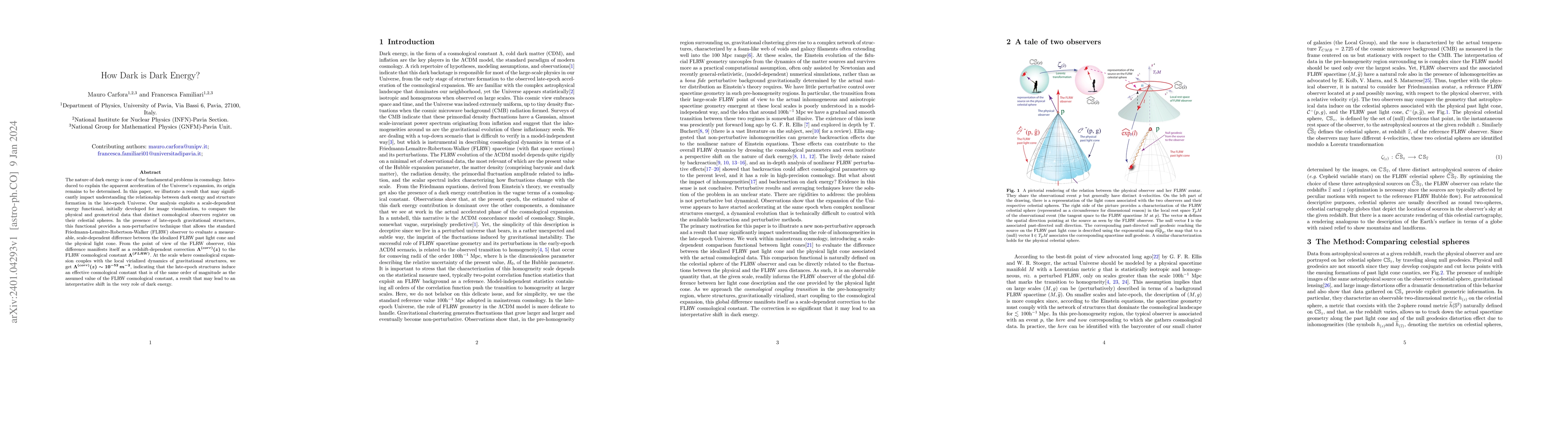 The nature of dark energy is one of the fundamental problems in cosmology. Introduced to explain the apparent acceleration of the Universe's expansion, its origin remains to be determined. In this paper, we illustrate a result that may significantly impact understanding the relationship between dark energy and structure formation in the late-epoch Universe. Our analysis exploits a scale-dependent energy functional, initially developed for image visualization, to compare the physical and geometrical data that distinct cosmological observers register on their celestial spheres. In the presence of late-epoch gravitational structures, this functional provides a non-perturbative technique that allows the standard Friedmann-Lema\^itre-Robertson-Walker (FLRW) observer to evaluate a measurable, scale-dependent difference between the idealized FLRW past light cone and the physical light cone. From the point of view of the FLRW observer, this difference manifests itself as a redshift-dependent correction $\Lambda^{(corr)}(z)$ to the FLRW cosmological constant $\Lambda^{(FLRW)}$. At the scale where cosmological expansion couples with the local virialized dynamics of gravitational structures, we get $\Lambda^{(corr)}(z)\sim 10^{-52}\,m^{-2}$, indicating that the late-epoch structures induce an effective cosmological constant that is of the same order of magnitude as the assumed value of the FLRW cosmological constant, a result that may lead to an interpretative shift in the very role of dark energy.