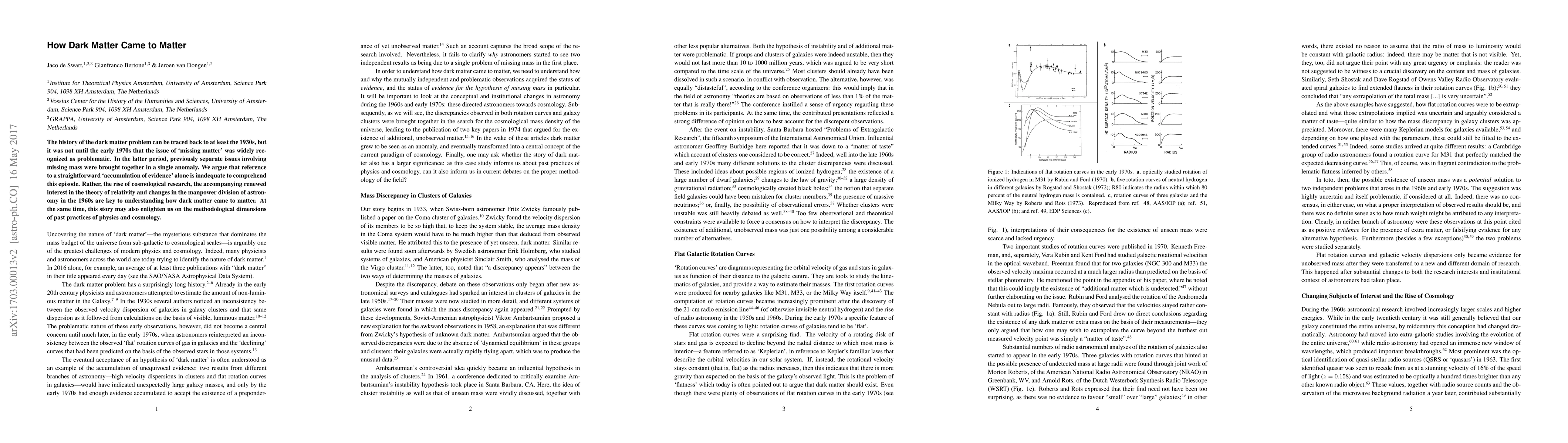 The paper explores how dark matter became a recognized issue in astrophysics, tracing its roots to the 1930s, with key factors including cosmological research, renewed interest in relativity, and changes in astronomy manpower.
