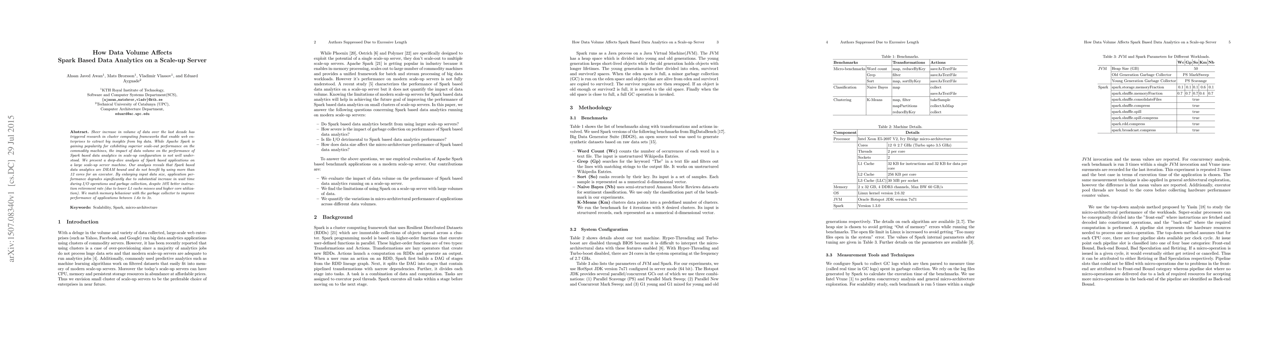 This paper investigates the performance of Spark-based data analytics on a scale-up server, finding that while Spark shows good scale-out performance on clusters, it is DRAM bound and does not benefit from more than 12 cores per executor. Increasing data volume significantly degrades performance due to increased I/O wait time and garbage collection, despite improved instruction retirement rate. Memory optimization techniques improve application performance by 1.6x to 3x.