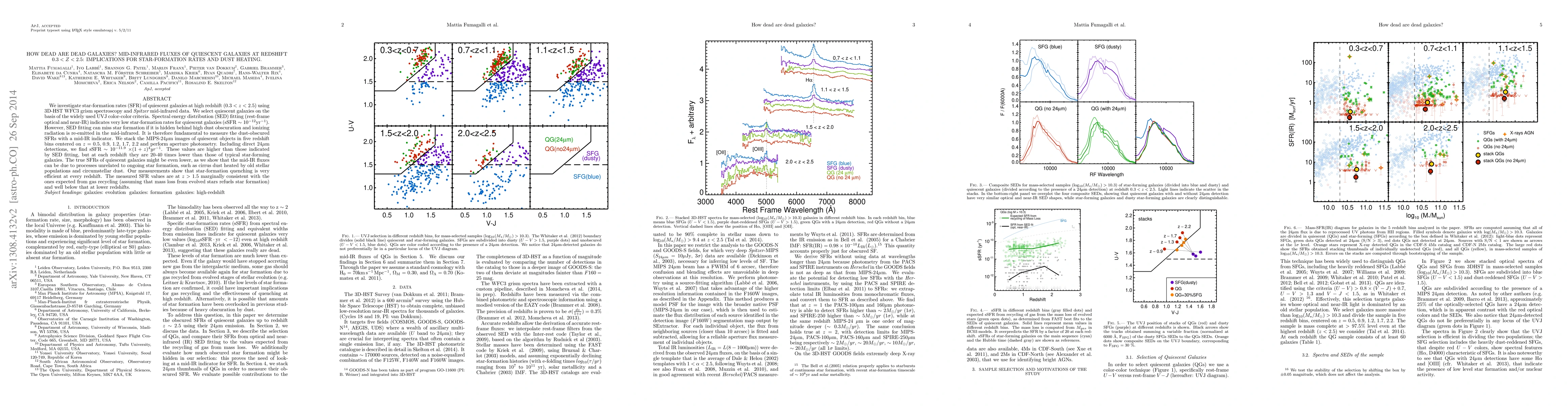 This paper examines the star formation rates (SFR) of quiescent galaxies at redshifts 0.3 < z < 2.5 using spectroscopic and mid-infrared data, finding very low SFRs (~10^-12 yr^-1) but higher values (~10^-11.9 * (1+z)^4 yr^-1) when accounting for dust-obscured star formation. The study concludes that star formation quenching is highly effective, with SFRs 20-40 times lower than typical star-forming galaxies.