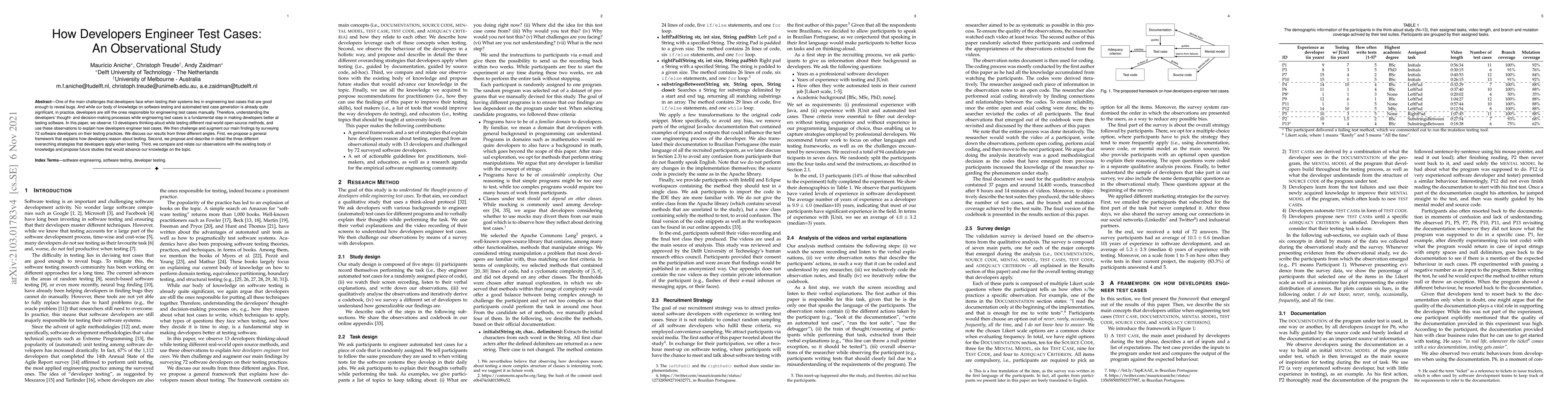 This study observes 13 developers thinking-aloud while manually creating test cases for open-source software, revealing three main strategies they use. The findings are supplemented by a survey of 72 developers, proposing a framework for understanding developer reasoning in testing.