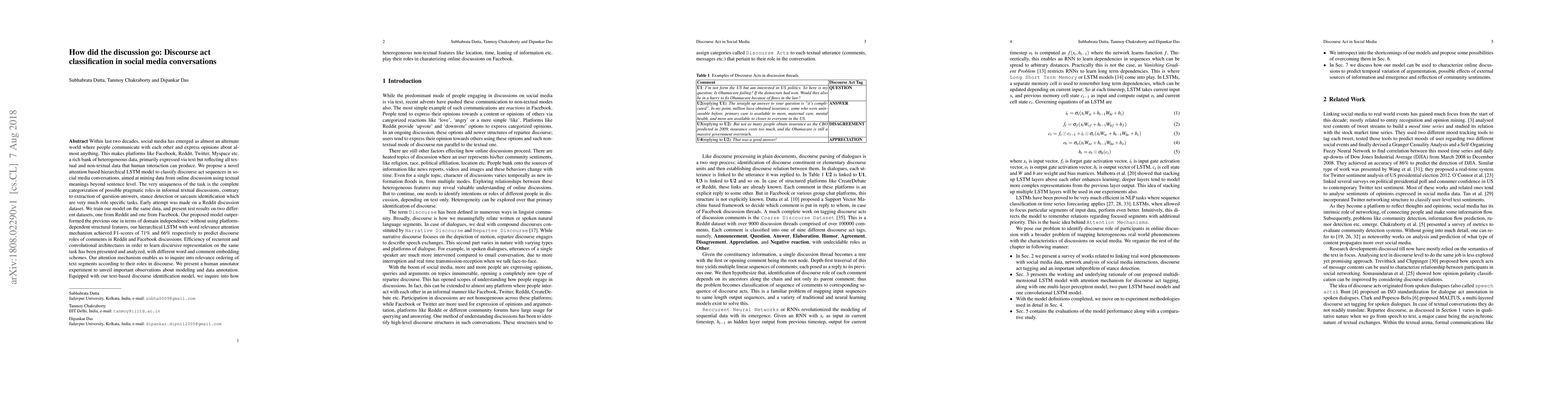 We propose a novel attention based hierarchical LSTM model to classify discourse act sequences in social media conversations, aimed at mining data from online discussion using textual meanings beyond sentence level. The very uniqueness of the task is the complete categorization of possible pragmatic roles in informal textual discussions, contrary to extraction of question-answers, stance detection or sarcasm identification which are very much role specific tasks. Early attempt was made on a Reddit discussion dataset. We train our model on the same data, and present test results on two different datasets, one from Reddit and one from Facebook. Our proposed model outperformed the previous one in terms of domain independence; without using platform-dependent structural features, our hierarchical LSTM with word relevance attention mechanism achieved F1-scores of 71\% and 66\% respectively to predict discourse roles of comments in Reddit and Facebook discussions. Efficiency of recurrent and convolutional architectures in order to learn discursive representation on the same task has been presented and analyzed, with different word and comment embedding schemes. Our attention mechanism enables us to inquire into relevance ordering of text segments according to their roles in discourse. We present a human annotator experiment to unveil important observations about modeling and data annotation. Equipped with our text-based discourse identification model, we inquire into how heterogeneous non-textual features like location, time, leaning of information etc. play their roles in charaterizing online discussions on Facebook.