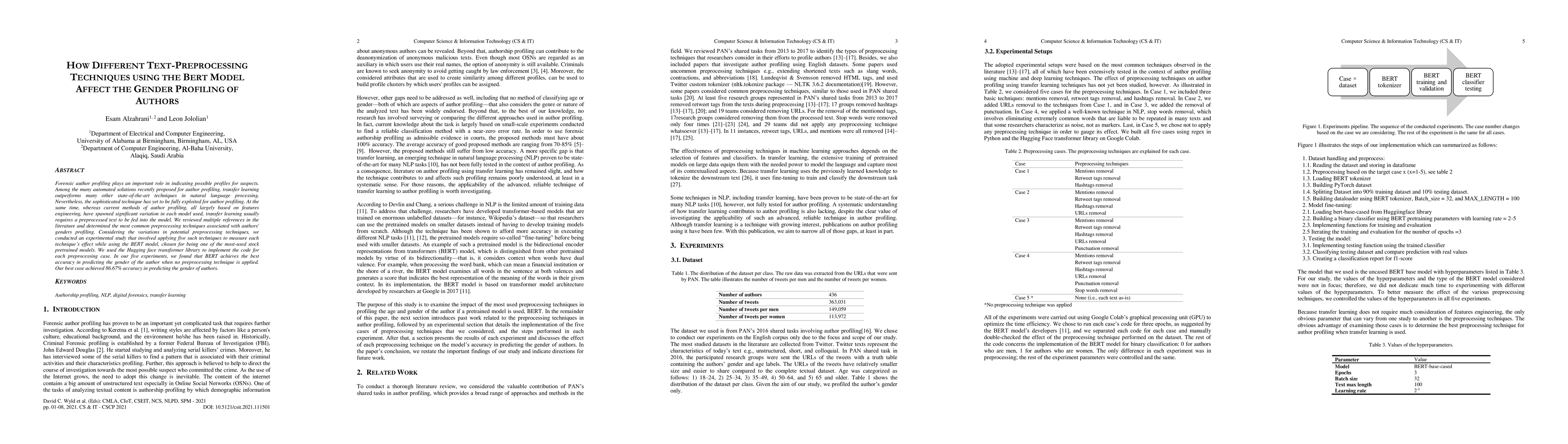 Using the BERT model, researchers found that no preprocessing technique improves accuracy in author gender profiling, with a best case achieving 86.67% accuracy.