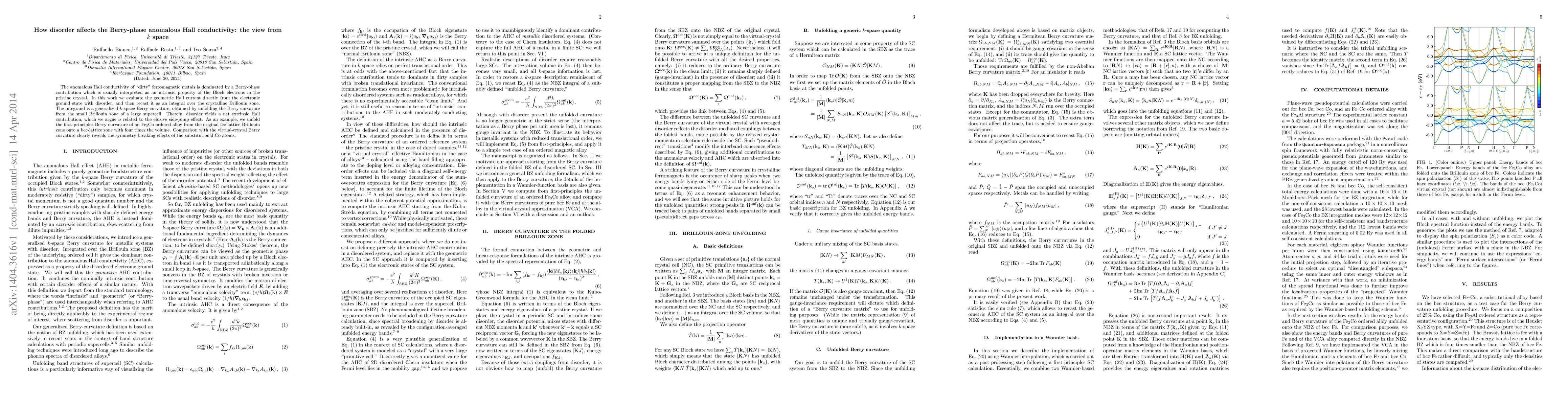 The anomalous Hall conductivity of "dirty" ferromagnetic metals is dominated by a Berry-phase contribution which is usually interpreted as an intrinsic property of the Bloch electrons in the pristine crystal. In this work we evaluate the geometric Hall current directly from the electronic ground state with disorder, and then recast it as an integral over the crystalline Brillouin zone. The integrand is a generalized k-space Berry curvature, obtained by unfolding the Berry curvature from the small Brillouin zone of a large supercell. Therein, disorder yields a net extrinsic Hall contribution, which we argue is related to the elusive side-jump effect. As an example, we unfold the first-principles Berry curvature of an Fe3Co ordered alloy from the original fcc-lattice Brillouin zone onto a bcc-lattice zone with four times the volume. Comparison with the virtual-crystal Berry curvature clearly reveals the symmetry-breaking effects of the substitutional Co atoms.