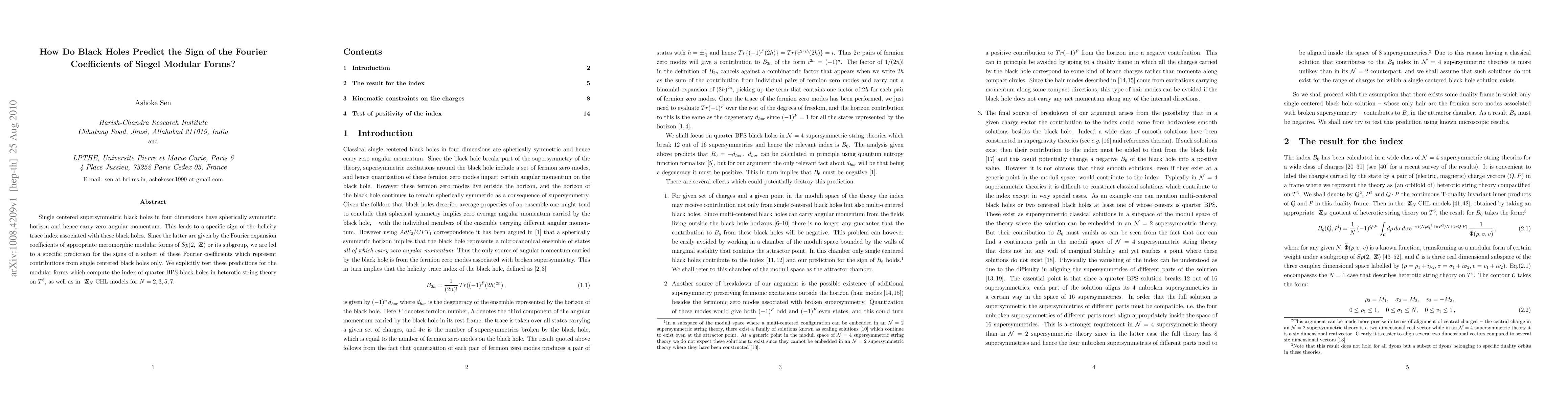 This paper explores how the properties of single-centered supersymmetric black holes in four dimensions predict the signs of specific Fourier coefficients of Siegel modular forms, particularly those related to the index of quarter BPS black holes in string theory. The findings provide a unique connection between black hole physics and modular forms.