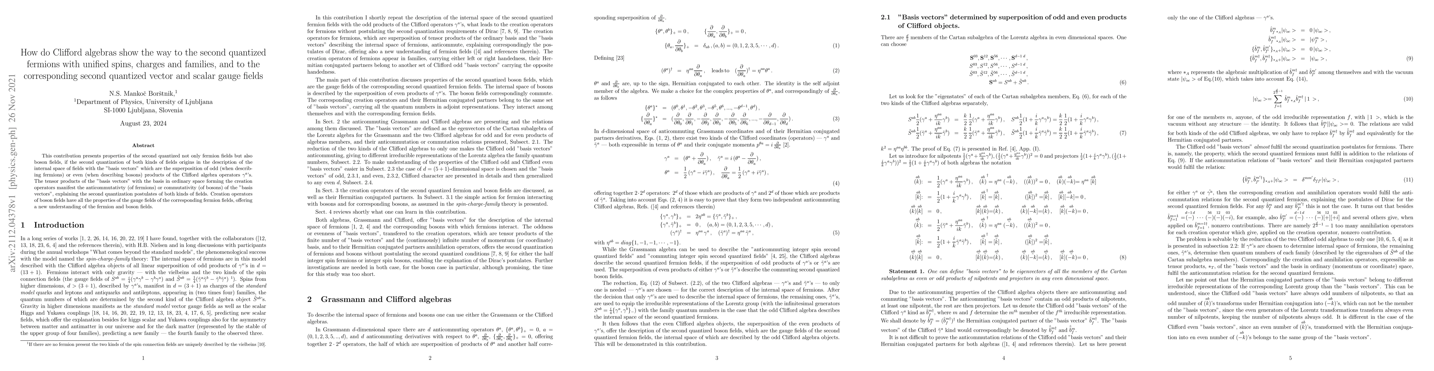 This paper explores how Clifford algebras help create a unified framework for second-quantized fermions with multiple spins, charges, and families, as well as corresponding boson fields and gauge fields.