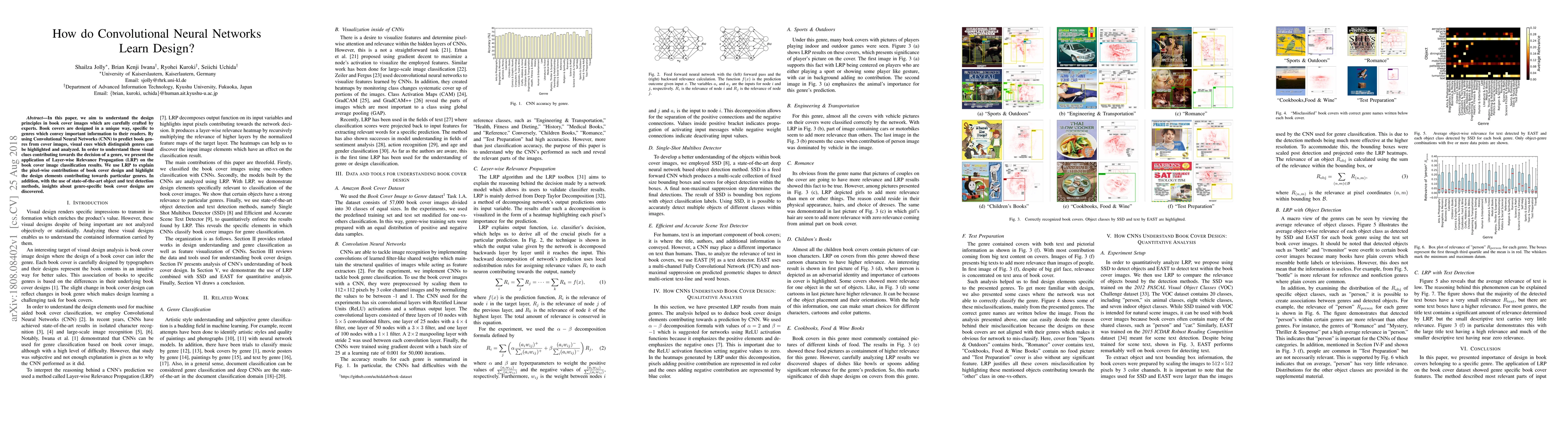 This paper explores how Convolutional Neural Networks (CNNs) learn design principles from book cover images to predict genres, using Layer-wise Relevance Propagation (LRP) to analyze visual cues and genre-specific design elements, and employing object and text detection methods to uncover insights into genre-specific cover designs.