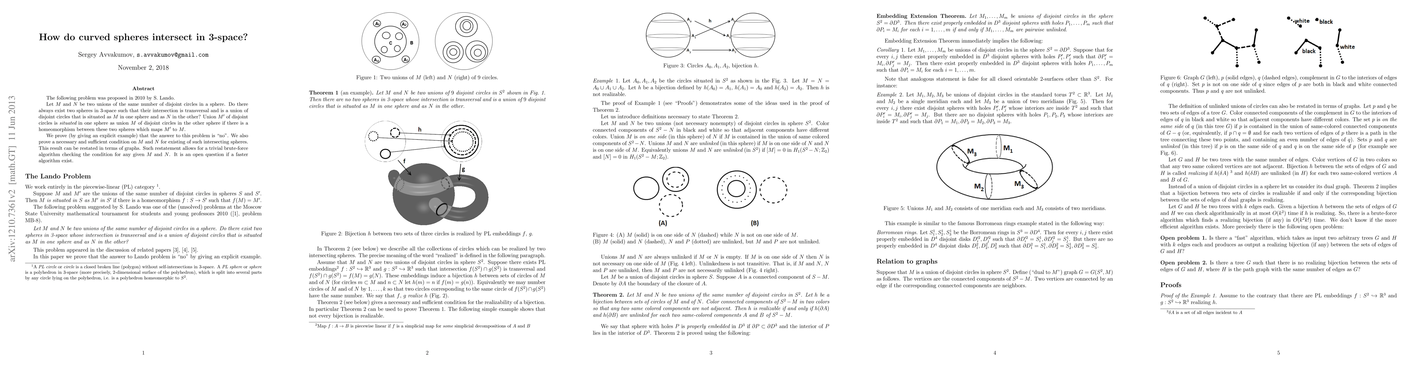 The following problem was proposed in 2010 by S. Lando. Let $M$ and $N$ be two unions of the same number of disjoint circles in a sphere. Do there always exist two spheres in 3-space such that their intersection is transversal and is a union of disjoint circles that is situated as $M$ in one sphere and as $N$ in the other? Union $M'$ of disjoint circles is {\it situated} in one sphere as union $M$ of disjoint circles in the other sphere if there is a homeomorphism between these two spheres which maps $M'$ to $M$. We prove (by giving an explicit example) that the answer to this problem is "no". We also prove a necessary and sufficient condition on $M$ and $N$ for existing of such intersecting spheres. This result can be restated in terms of graphs. Such restatement allows for a trivial brute-force algorithm checking the condition for any given $M$ and $N$. It is an open question if a faster algorithm exist.