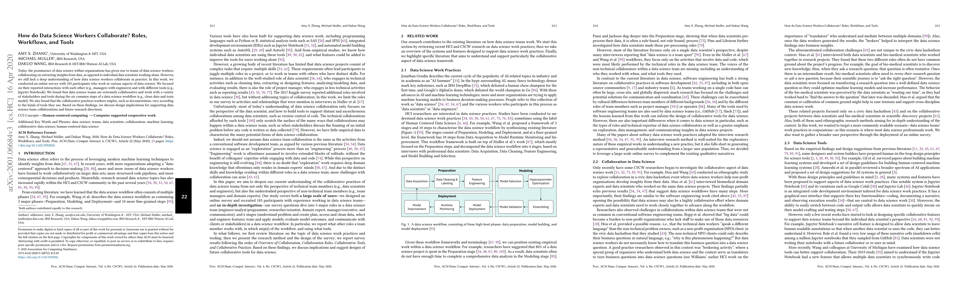 Today, the prominence of data science within organizations has given rise to teams of data science workers collaborating on extracting insights from data, as opposed to individual data scientists working alone. However, we still lack a deep understanding of how data science workers collaborate in practice. In this work, we conducted an online survey with 183 participants who work in various aspects of data science. We focused on their reported interactions with each other (e.g., managers with engineers) and with different tools (e.g., Jupyter Notebook). We found that data science teams are extremely collaborative and work with a variety of stakeholders and tools during the six common steps of a data science workflow (e.g., clean data and train model). We also found that the collaborative practices workers employ, such as documentation, vary according to the kinds of tools they use. Based on these findings, we discuss design implications for supporting data science team collaborations and future research directions.