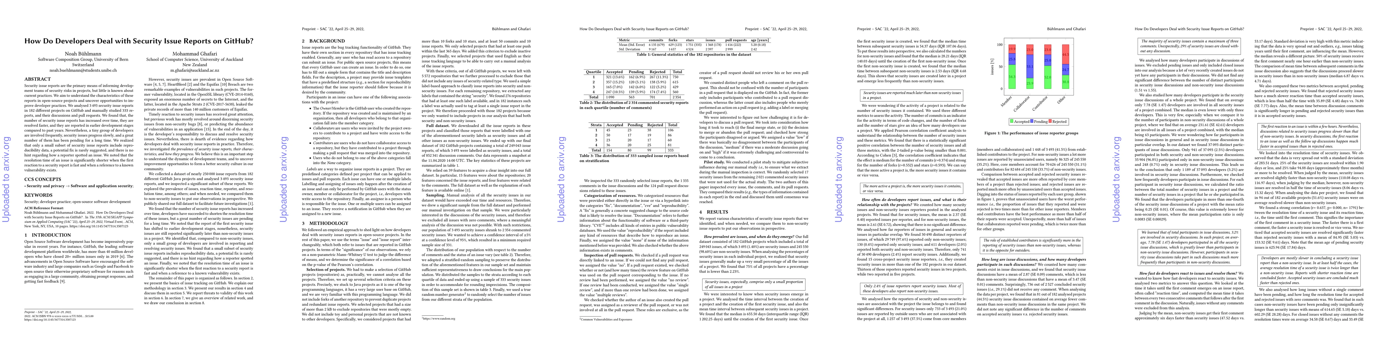This study analyzes 3,493 security issue reports on GitHub, revealing that while the number of reports has increased and resolution times have improved, a small group of developers handles most issues, and many remain unresolved. The report highlights the need for better reproducibility data and suggested fixes to enhance security practices.