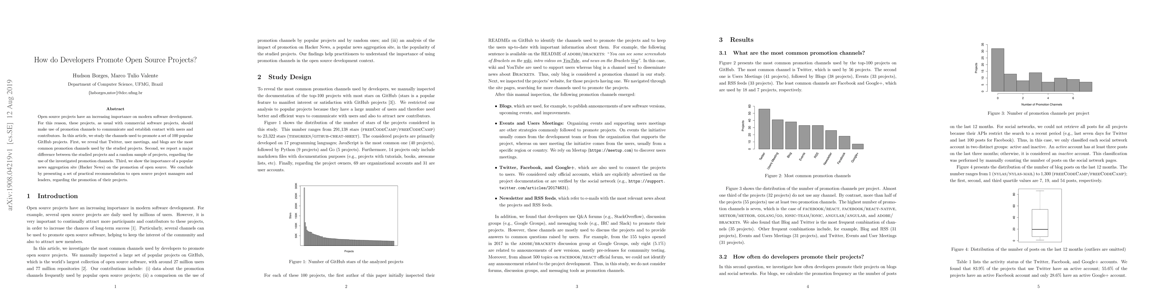 This study investigates the promotion channels used by 100 popular GitHub projects, finding that Twitter, user meetings, and blogs are the most prevalent. The research highlights a significant difference in promotion strategies between these popular projects and a random sample, emphasizing the crucial role of Hacker News in open source promotion. Practical recommendations for project managers are provided based on these findings.