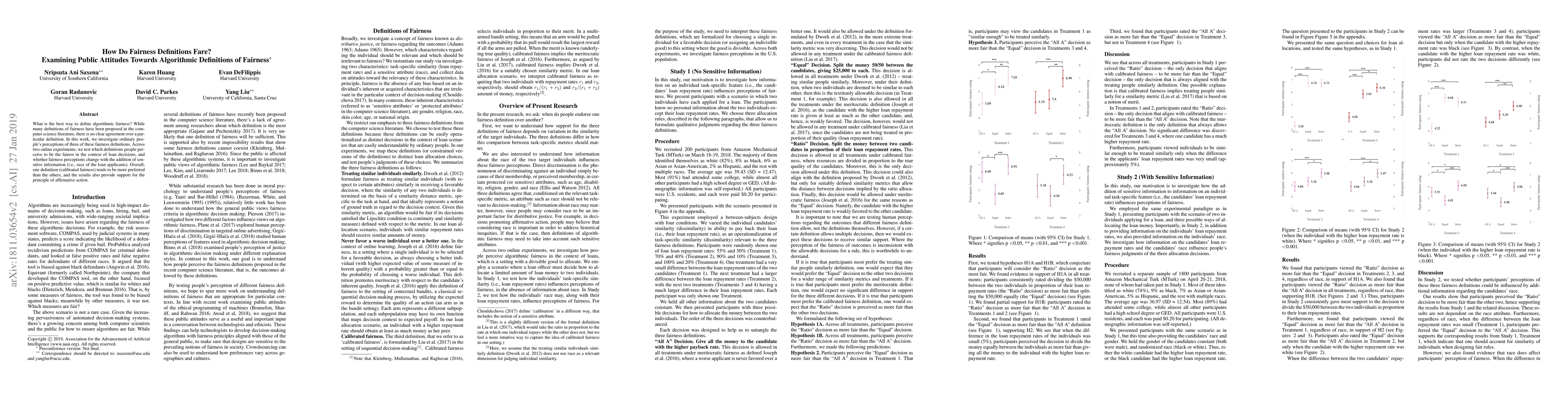 This study explores public perceptions of three algorithmic fairness definitions through online experiments, finding that calibrated fairness is most preferred, especially when considering sensitive information like race, which supports the principle of affirmative action.