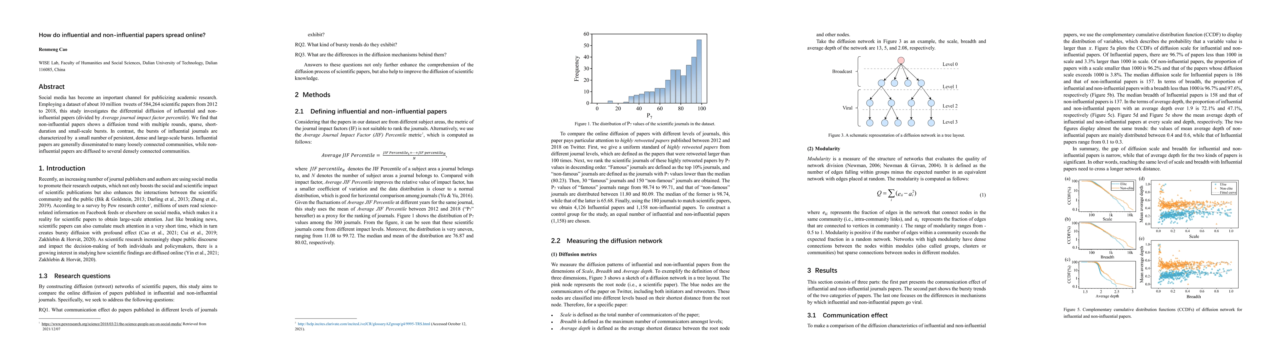 This study analyzes the online diffusion patterns of influential versus non-influential academic papers using a large dataset of tweets. It finds that non-influential papers spread in sparse, short-duration bursts, while influential papers experience persistent, large-scale dissemination to diverse communities.