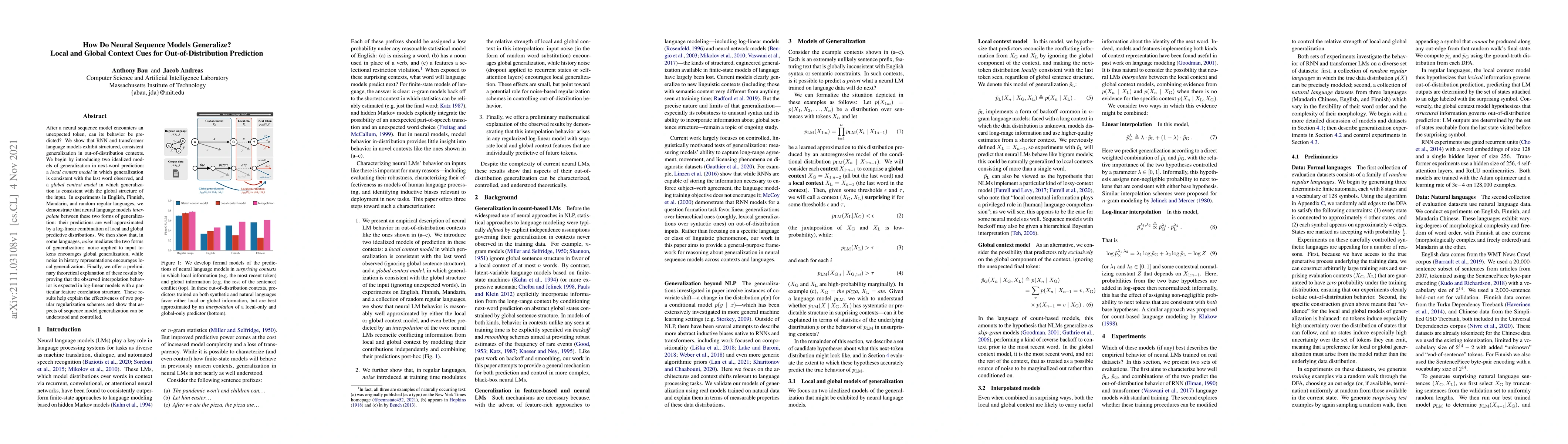 After a neural sequence model encounters an unexpected token, can its behavior be predicted? We show that RNN and transformer language models exhibit structured, consistent generalization in out-of-distribution contexts. We begin by introducing two idealized models of generalization in next-word prediction: a local context model in which generalization is consistent with the last word observed, and a global context model in which generalization is consistent with the global structure of the input. In experiments in English, Finnish, Mandarin, and random regular languages, we demonstrate that neural language models interpolate between these two forms of generalization: their predictions are well-approximated by a log-linear combination of local and global predictive distributions. We then show that, in some languages, noise mediates the two forms of generalization: noise applied to input tokens encourages global generalization, while noise in history representations encourages local generalization. Finally, we offer a preliminary theoretical explanation of these results by proving that the observed interpolation behavior is expected in log-linear models with a particular feature correlation structure. These results help explain the effectiveness of two popular regularization schemes and show that aspects of sequence model generalization can be understood and controlled.