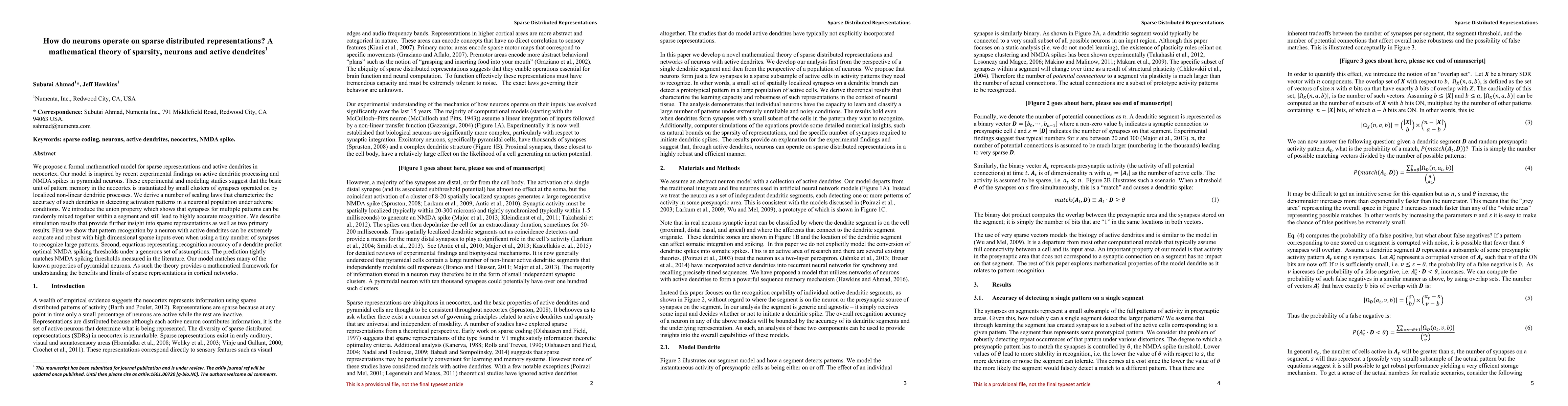 We propose a formal mathematical model for sparse representations and active dendrites in neocortex. Our model is inspired by recent experimental findings on active dendritic processing and NMDA spikes in pyramidal neurons. These experimental and modeling studies suggest that the basic unit of pattern memory in the neocortex is instantiated by small clusters of synapses operated on by localized non-linear dendritic processes. We derive a number of scaling laws that characterize the accuracy of such dendrites in detecting activation patterns in a neuronal population under adverse conditions. We introduce the union property which shows that synapses for multiple patterns can be randomly mixed together within a segment and still lead to highly accurate recognition. We describe simulation results that provide further insight into sparse representations as well as two primary results. First we show that pattern recognition by a neuron with active dendrites can be extremely accurate and robust with high dimensional sparse inputs even when using a tiny number of synapses to recognize large patterns. Second, equations representing recognition accuracy of a dendrite predict optimal NMDA spiking thresholds under a generous set of assumptions. The prediction tightly matches NMDA spiking thresholds measured in the literature. Our model matches many of the known properties of pyramidal neurons. As such the theory provides a mathematical framework for understanding the benefits and limits of sparse representations in cortical networks.