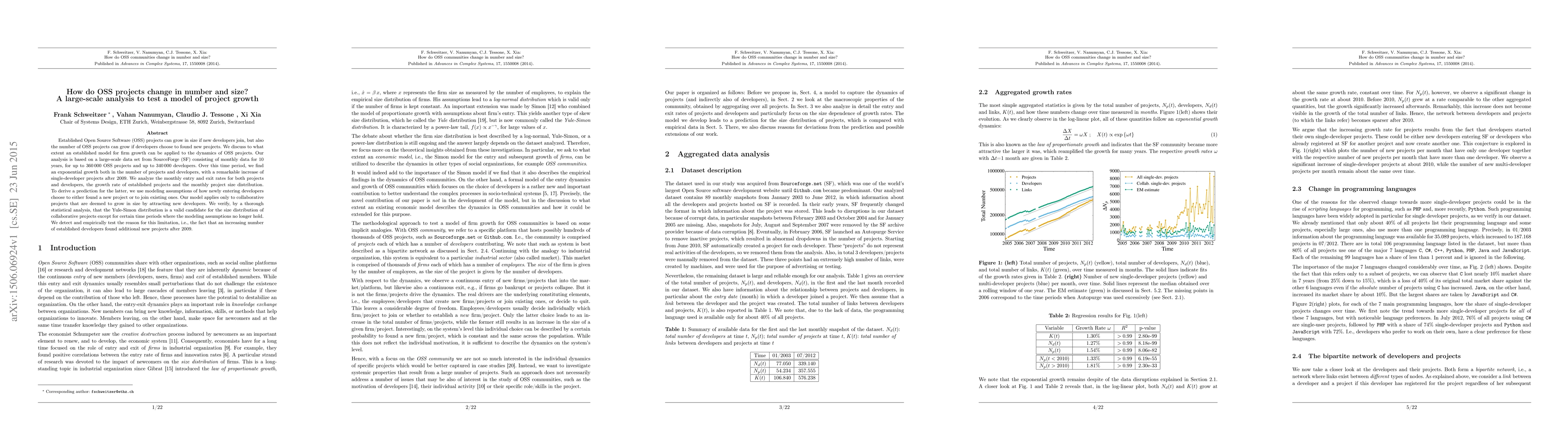 Established Open Source Software (OSS) projects can grow in size if new developers join, but also the number of OSS projects can grow if developers choose to found new projects. We discuss to what extent an established model for firm growth can be applied to the dynamics of OSS projects. Our analysis is based on a large-scale data set from SourceForge (SF) consisting of monthly data for 10 years, for up to 360'000 OSS projects and up to 340'000 developers. Over this time period, we find an exponential growth both in the number of projects and developers, with a remarkable increase of single-developer projects after 2009. We analyze the monthly entry and exit rates for both projects and developers, the growth rate of established projects and the monthly project size distribution. To derive a prediction for the latter, we use modeling assumptions of how newly entering developers choose to either found a new project or to join existing ones. Our model applies only to collaborative projects that are deemed to grow in size by attracting new developers. We verify, by a thorough statistical analysis, that the Yule-Simon distribution is a valid candidate for the size distribution of collaborative projects except for certain time periods where the modeling assumptions no longer hold. We detect and empirically test the reason for this limitation, i.e., the fact that an increasing number of established developers found additional new projects after 2009.
