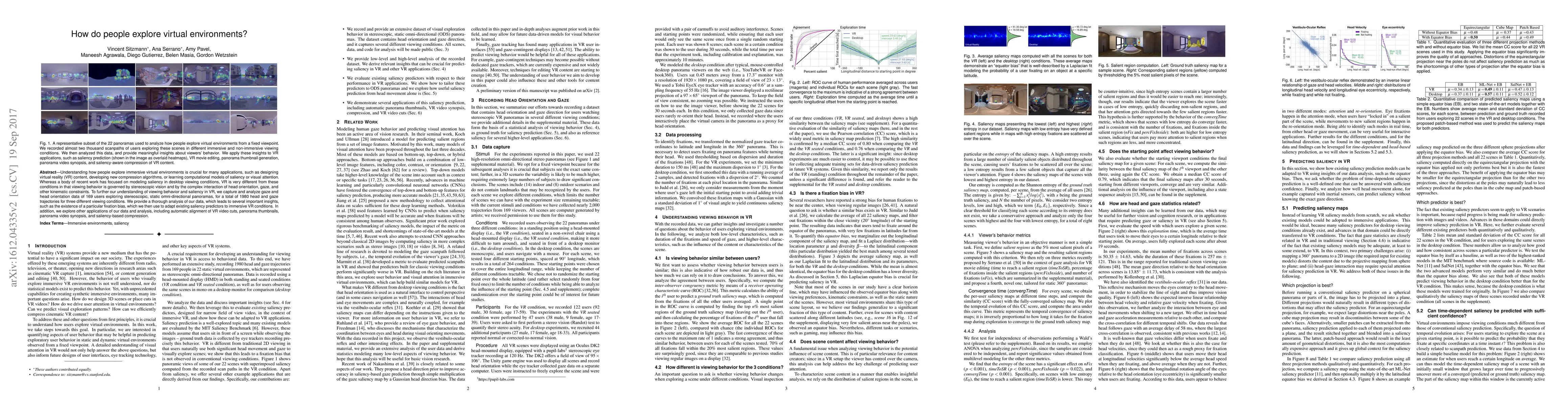 Understanding how people explore immersive virtual environments is crucial for many applications, such as designing virtual reality (VR) content, developing new compression algorithms, or learning computational models of saliency or visual attention. Whereas a body of recent work has focused on modeling saliency in desktop viewing conditions, VR is very different from these conditions in that viewing behavior is governed by stereoscopic vision and by the complex interaction of head orientation, gaze, and other kinematic constraints. To further our understanding of viewing behavior and saliency in VR, we capture and analyze gaze and head orientation data of 169 users exploring stereoscopic, static omni-directional panoramas, for a total of 1980 head and gaze trajectories for three different viewing conditions. We provide a thorough analysis of our data, which leads to several important insights, such as the existence of a particular fixation bias, which we then use to adapt existing saliency predictors to immersive VR conditions. In addition, we explore other applications of our data and analysis, including automatic alignment of VR video cuts, panorama thumbnails, panorama video synopsis, and saliency-based compression.