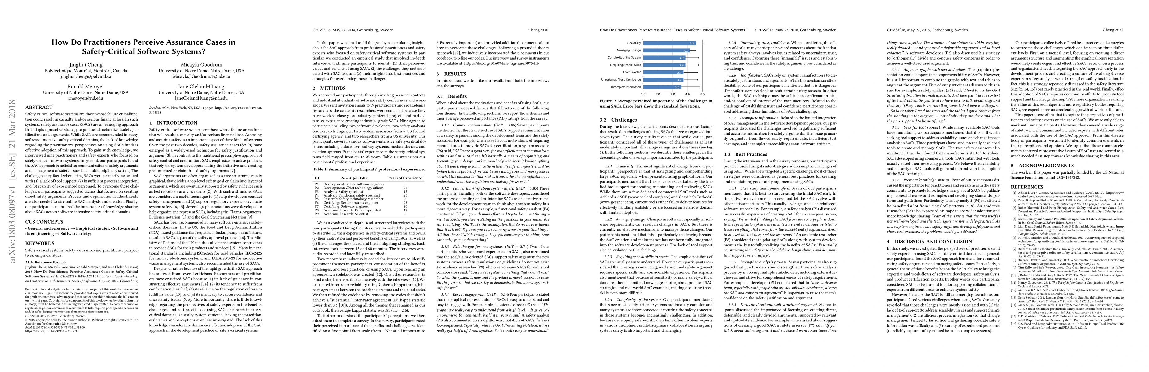 This study explores practitioners' perceptions of safety assurance cases (SACs) in safety-critical software systems, finding they view SACs positively for communication and safety management but face challenges due to lack of tool support, process integration, and experienced personnel. Participants suggest creating direct safety arguments and organizational adjustments to improve SAC usage.