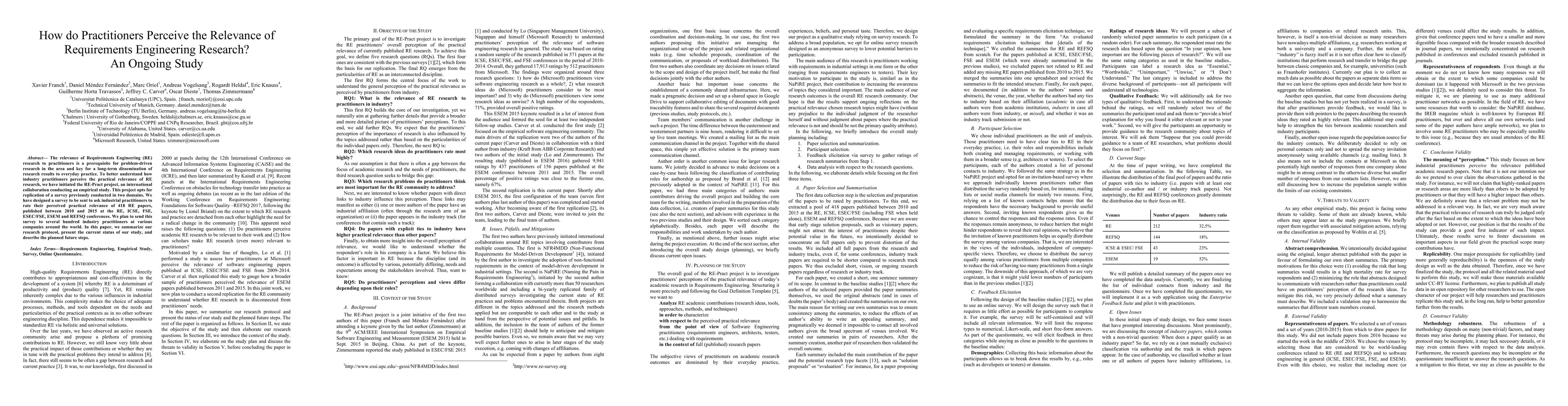 This study investigates how industry practitioners perceive the relevance of Requirements Engineering research, using a survey to gather data from several hundred practitioners worldwide. The ongoing RE-Pract project aims to replicate previous work and assess the practical relevance of 418 RE papers published between 2010 and 2015.