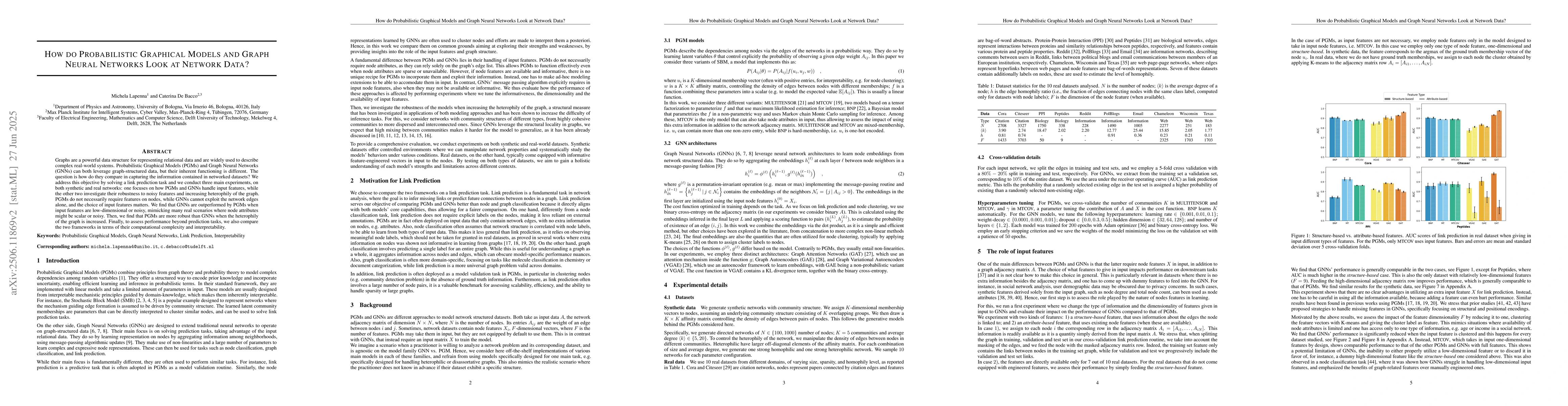 Graphs are a powerful data structure for representing relational data and are widely used to describe complex real-world systems. Probabilistic Graphical Models (PGMs) and Graph Neural Networks (GNNs) can both leverage graph-structured data, but their inherent functioning is different. The question is how do they compare in capturing the information contained in networked datasets? We address this objective by solving a link prediction task and we conduct three main experiments, on both synthetic and real networks: one focuses on how PGMs and GNNs handle input features, while the other two investigate their robustness to noisy features and increasing heterophily of the graph. PGMs do not necessarily require features on nodes, while GNNs cannot exploit the network edges alone, and the choice of input features matters. We find that GNNs are outperformed by PGMs when input features are low-dimensional or noisy, mimicking many real scenarios where node attributes might be scalar or noisy. Then, we find that PGMs are more robust than GNNs when the heterophily of the graph is increased. Finally, to assess performance beyond prediction tasks, we also compare the two frameworks in terms of their computational complexity and interpretability.