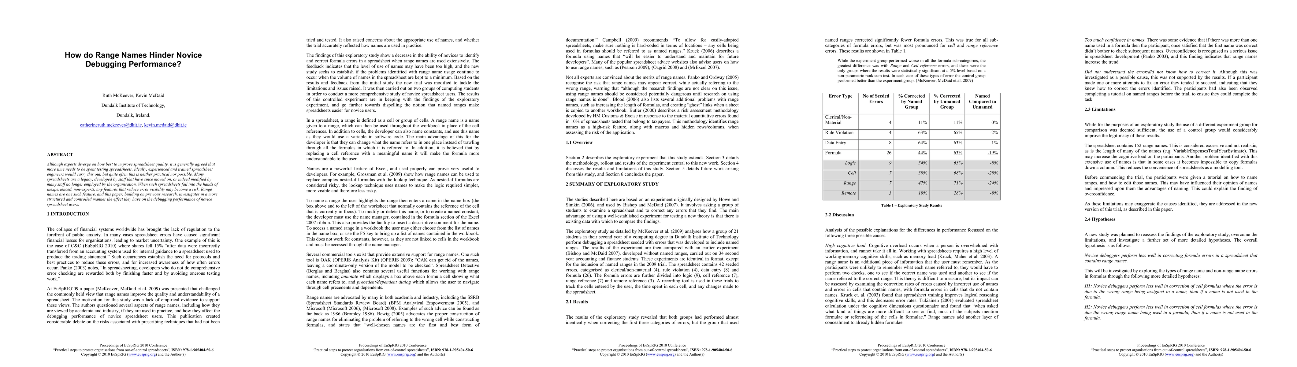 This paper examines how range names in spreadsheets hinder the debugging performance of novice users, finding that these features can obscure error visibility and complicate troubleshooting efforts. The study highlights the risks associated with inexperienced users encountering legacy spreadsheets containing range names.