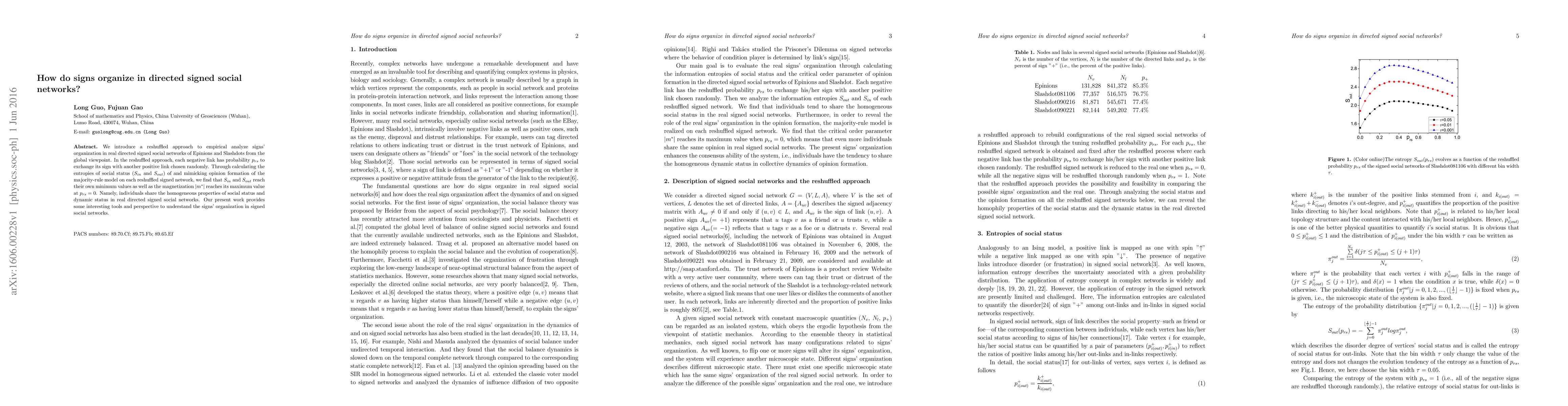 This paper investigates how signs organize in directed signed social networks using a reshuffled approach, finding that minimum social status entropies and maximum magnetization occur at $p_{rs}=0$, indicating homogeneous properties in social status and dynamic status. The study provides insights into the organization of signs in real networks like Epinions and Slashdot.