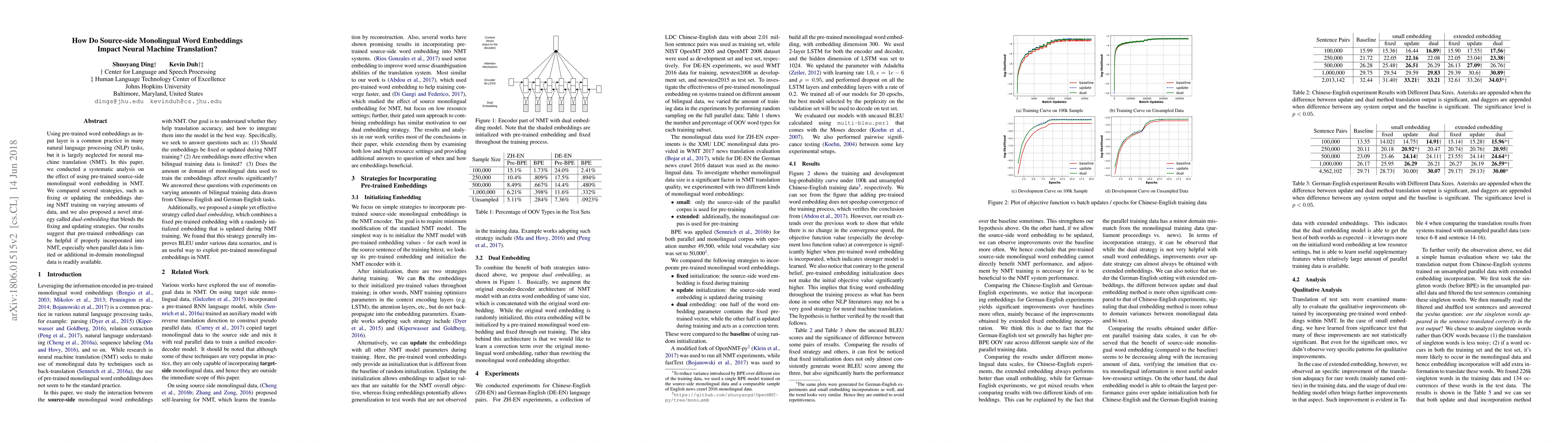 This paper investigates the impact of incorporating pre-trained monolingual word embeddings from the source language into neural machine translation (NMT) systems. The study finds that properly integrating these embeddings, especially through a novel dual-embedding approach, can enhance translation performance, particularly when parallel data is scarce.