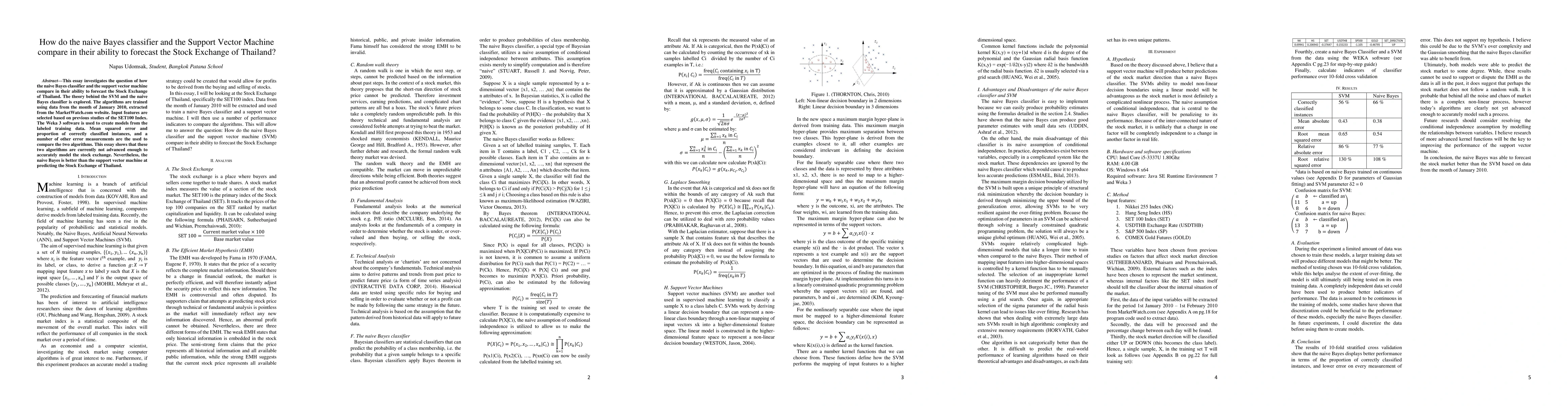 This essay investigates the question of how the naive Bayes classifier and the support vector machine compare in their ability to forecast the Stock Exchange of Thailand. The theory behind the SVM and the naive Bayes classifier is explored. The algorithms are trained using data from the month of January 2010, extracted from the MarketWatch.com website. Input features are selected based on previous studies of the SET100 Index. The Weka 3 software is used to create models from the labeled training data. Mean squared error and proportion of correctly classified instances, and a number of other error measurements are the used to compare the two algorithms. This essay shows that these two algorithms are currently not advanced enough to accurately model the stock exchange. Nevertheless, the naive Bayes is better than the support vector machine at predicting the Stock Exchange of Thailand.