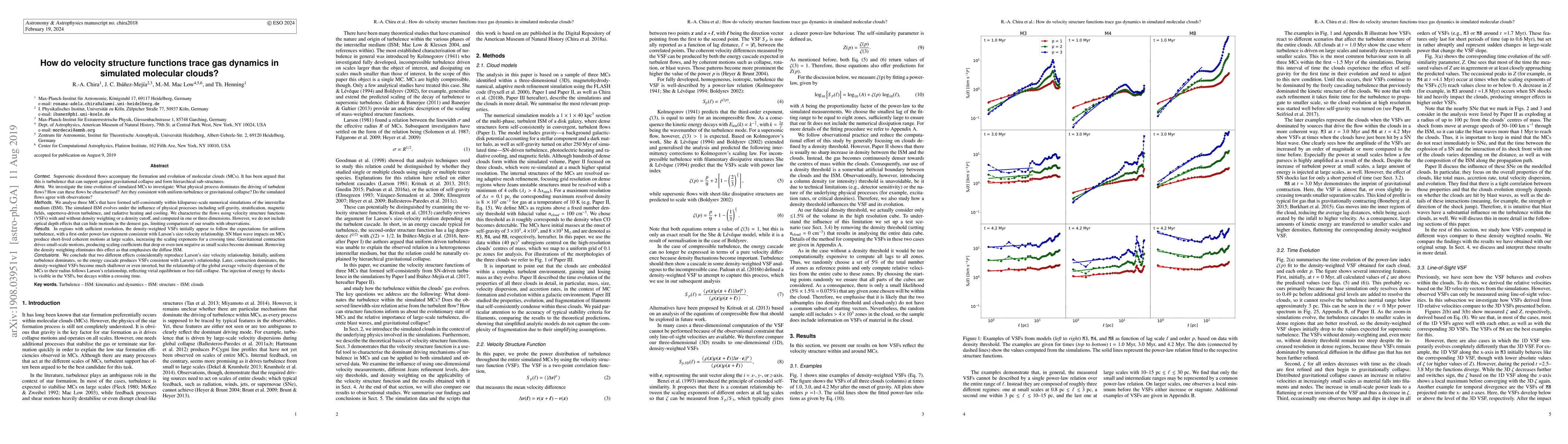 Context. Supersonic disordered flows accompany the formation and evolution of MCs. It has been argued that turbulence can support against gravitational collapse and form hierarchical sub-structures. Aims. We study the time evolution of simulated MCs to investigate: What physical process dominates the driving of turbulent flows? How can these flows be characterised? Do the simulated flows agree with observations? Methods. We analyse three MCs that have formed self-consistently within kpc-scale numerical simulations of the ISM. The simulated ISM evolves under the influence of physical processes including self-gravity, stratification, magnetic fields, supernova-driven turbulence, and radiative heating and cooling. We characterise the flows using VSFs with/out density weighting or a density cutoff, and computed in one or three dimensions. Results. In regions with sufficient resolution, the density-weighted VSFs initially appear to follow the expectations for uniform turbulence consistent with Larson's size-velocity relationship. SN blast wave impacts produce short-lived coherent motions at large scales, increasing the scaling exponents for a crossing time. Gravitational contraction drives small-scale motions, producing scaling coefficients that drop or even turn negative as small scales become dominant. Conclusions. We conclude that two different effects coincidentally reproduce Larson's size velocity relationship. Initially, uniform turbulence dominates, so the energy cascade produces VSFs consistent with Larson's relationship. Later, contraction dominates, the density-weighted VSFs become much shallower or even inverted, but the relationship of the global average velocity dispersion of the MCs to their radius follows Larson's relationship, reflecting virial equilibrium or free-fall collapse. The injection of energy by shocks is visible in the VSFs, but decays within a crossing time.
