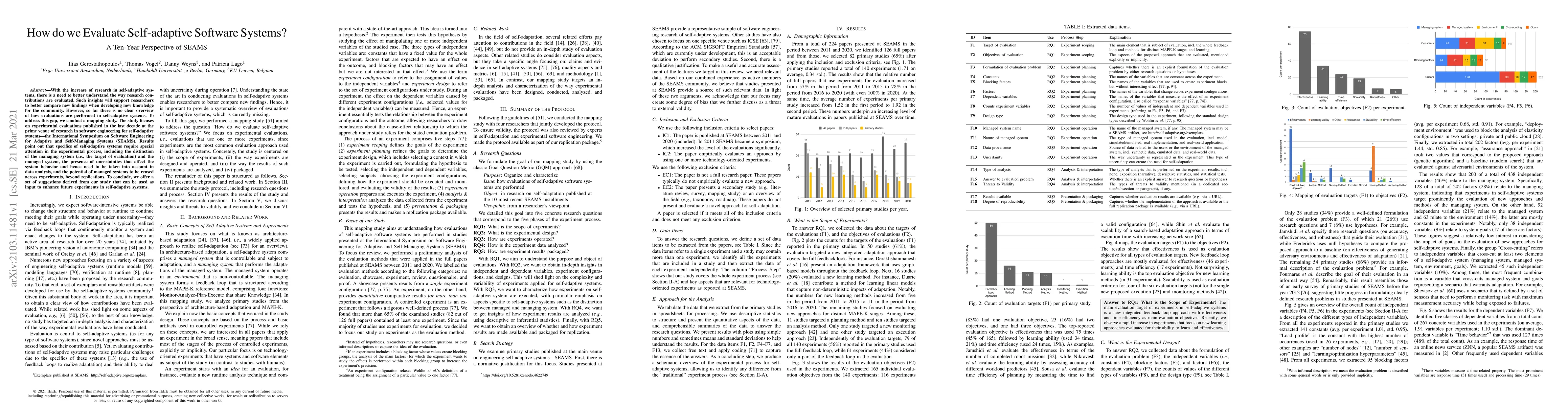 This paper conducts a mapping study on experimental evaluations in self-adaptive systems, revealing the need for special attention to the managing and managed systems, uncertainties, and reusability of managed systems. It proposes a set of suggestions to improve future experimental evaluations in this field.