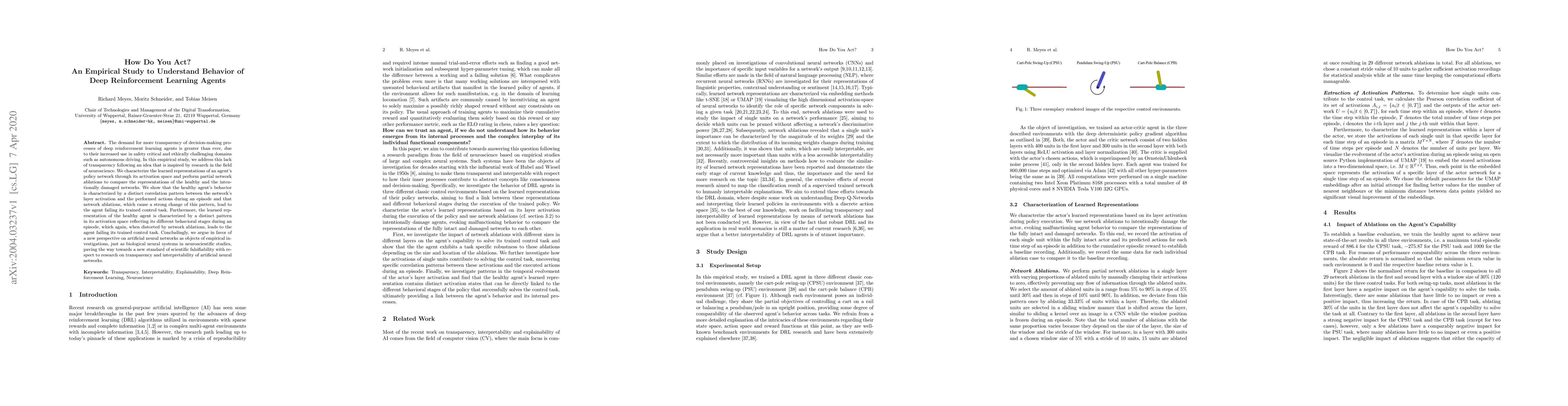 The demand for more transparency of decision-making processes of deep reinforcement learning agents is greater than ever, due to their increased use in safety critical and ethically challenging domains such as autonomous driving. In this empirical study, we address this lack of transparency following an idea that is inspired by research in the field of neuroscience. We characterize the learned representations of an agent's policy network through its activation space and perform partial network ablations to compare the representations of the healthy and the intentionally damaged networks. We show that the healthy agent's behavior is characterized by a distinct correlation pattern between the network's layer activation and the performed actions during an episode and that network ablations, which cause a strong change of this pattern, lead to the agent failing its trained control task. Furthermore, the learned representation of the healthy agent is characterized by a distinct pattern in its activation space reflecting its different behavioral stages during an episode, which again, when distorted by network ablations, leads to the agent failing its trained control task. Concludingly, we argue in favor of a new perspective on artificial neural networks as objects of empirical investigations, just as biological neural systems in neuroscientific studies, paving the way towards a new standard of scientific falsifiability with respect to research on transparency and interpretability of artificial neural networks.