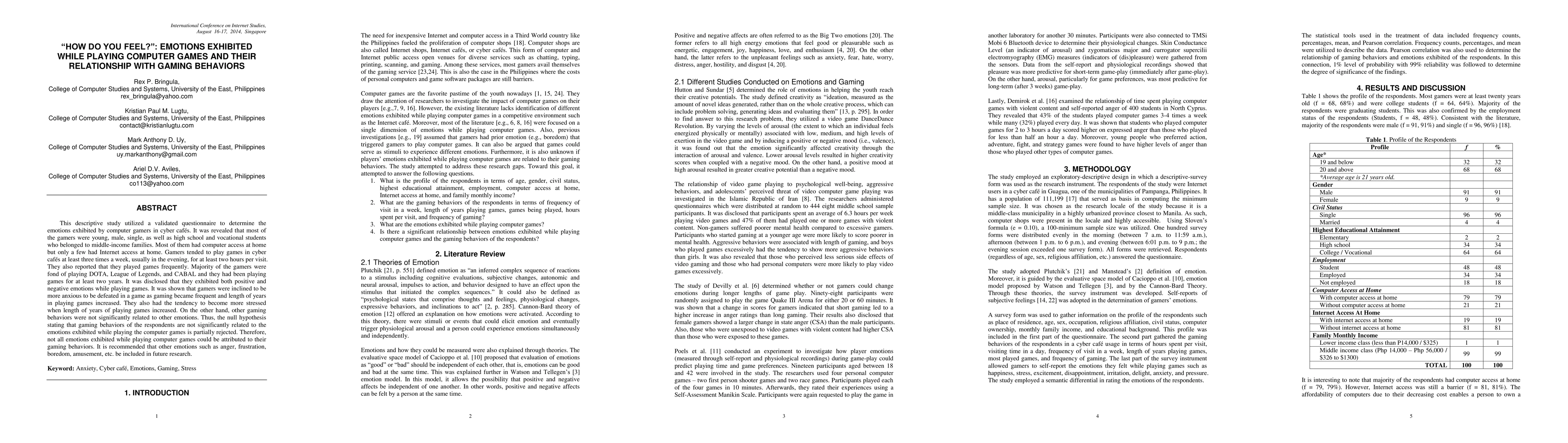 This descriptive study utilized a validated questionnaire to determine the emotions exhibited by computer gamers in cyber caf\'es. It was revealed that most of the gamers were young, male, single, as well as high school and vocational students who belonged to middle-income families. Most of them had computer access at home but only a few had Internet access at home. Gamers tended to play games in cyber caf\'es at least three times a week, usually in the evening, for at least two hours per visit. They also reported that they played games frequently. Majority of the gamers were fond of playing DOTA, League of Legends, and CABAL and they had been playing games for at least two years. It was disclosed that they exhibited both positive and negative emotions while playing games. It was shown that gamers were inclined to be more anxious to be defeated in a game as gaming became frequent and length of years in playing games increased. They also had the tendency to become more stressed when length of years of playing games increased. On the other hand, other gaming behaviors were not significantly related to other emotions. Thus, the null hypothesis stating that gaming behaviors of the respondents are not significantly related to the emotions exhibited while playing the computer games is partially rejected. Therefore, not all emotions exhibited while playing computer games could be attributed to their gaming behaviors. It is recommended that other emotions such as anger, frustration, boredom, amusement, etc. be included in future research.