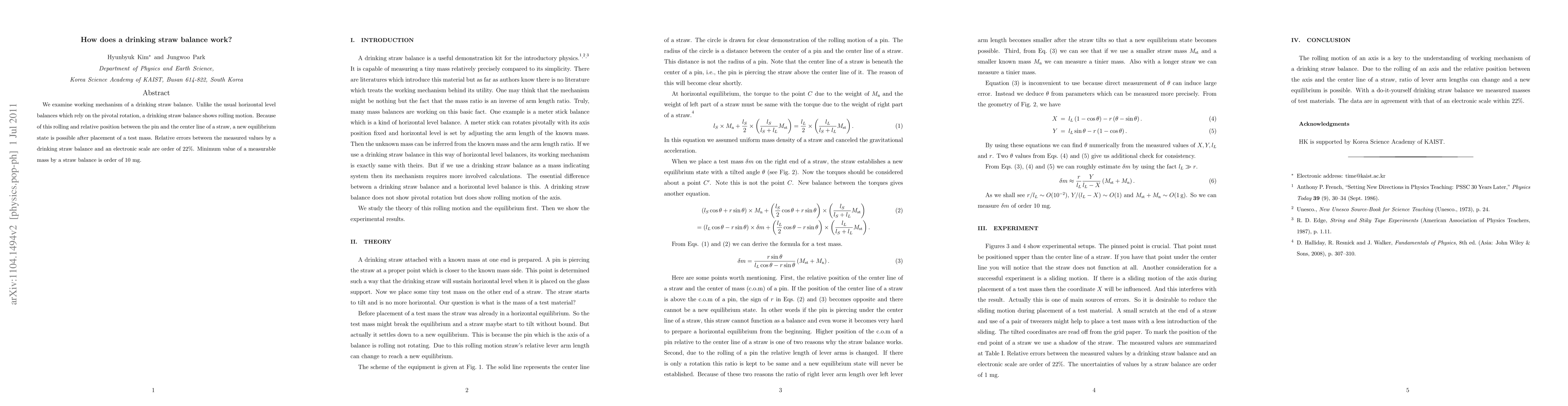 We examine working mechanism of a drinking straw balance. Unlike the usual horizontal level balances which rely on the pivotal rotation, a drinking straw balance shows rolling motion. Because of this rolling and relative position between the pin and the center line of a straw, a new equilibrium state is possible after placement of a test mass. Relative errors between the measured values by a drinking straw balance and an electronic scale are order of 22%. Minimum value of a measurable mass by a straw balance is order of 10 mg.