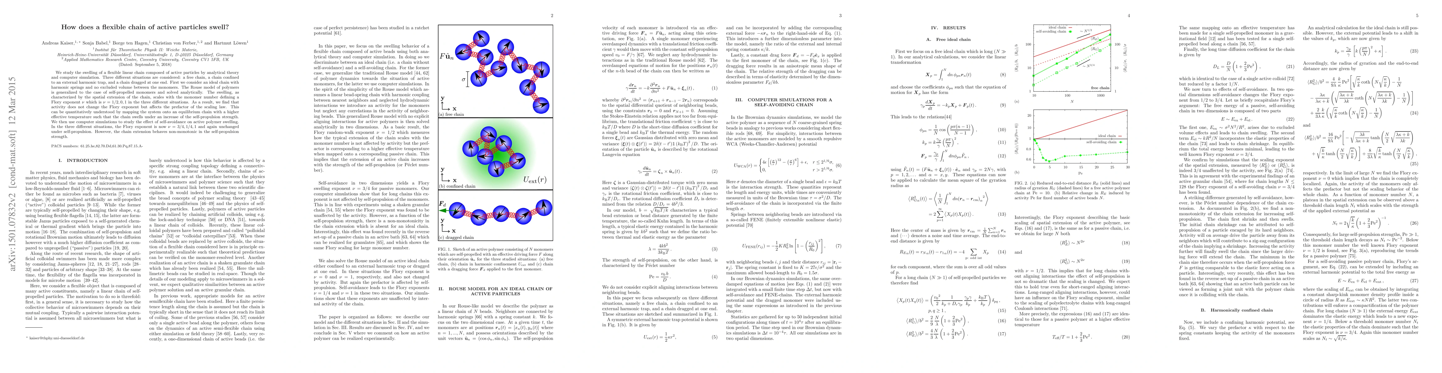This paper investigates the swelling of a flexible chain of active particles through analytical theory and computer simulations, finding that activity affects the chain's spatial extension but does not alter the Flory exponent, which scales as $\nu = 1/2, 0, 1$ for free, trapped, and dragged chains, respectively. Self-avoidance further modifies the swelling behavior.