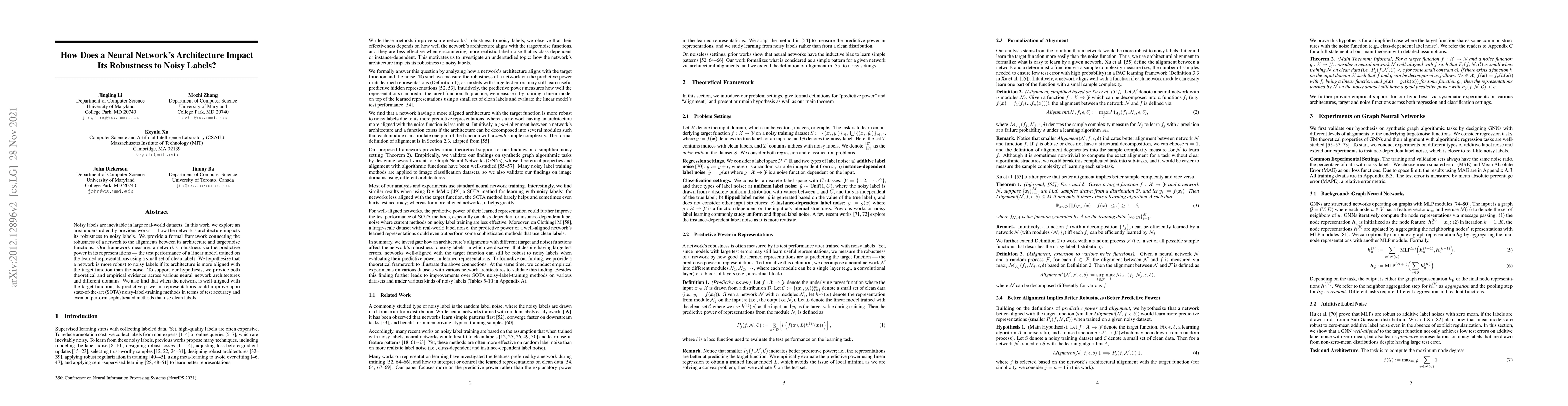 Noisy labels are inevitable in large real-world datasets. In this work, we explore an area understudied by previous works -- how the network's architecture impacts its robustness to noisy labels. We provide a formal framework connecting the robustness of a network to the alignments between its architecture and target/noise functions. Our framework measures a network's robustness via the predictive power in its representations -- the test performance of a linear model trained on the learned representations using a small set of clean labels. We hypothesize that a network is more robust to noisy labels if its architecture is more aligned with the target function than the noise. To support our hypothesis, we provide both theoretical and empirical evidence across various neural network architectures and different domains. We also find that when the network is well-aligned with the target function, its predictive power in representations could improve upon state-of-the-art (SOTA) noisy-label-training methods in terms of test accuracy and even outperform sophisticated methods that use clean labels.