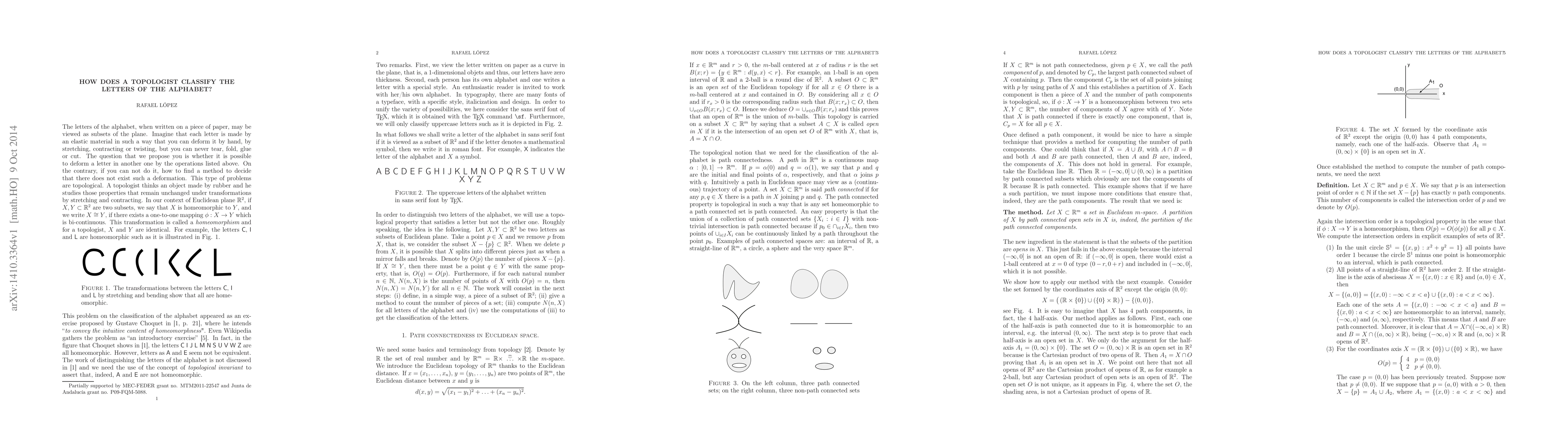 The paper approaches to the reader to topology with a curious example of topological classification by homeomorphisms applied to the letters of the alphabet viewed as subsets of Euclidean plane.