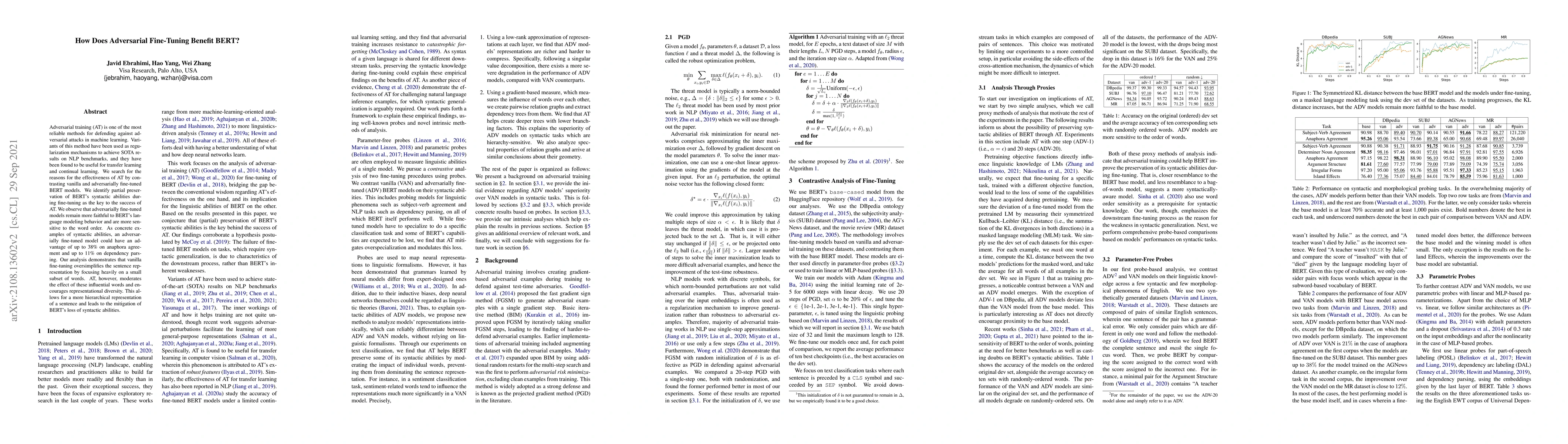 Adversarial training (AT) is one of the most reliable methods for defending against adversarial attacks in machine learning. Variants of this method have been used as regularization mechanisms to achieve SOTA results on NLP benchmarks, and they have been found to be useful for transfer learning and continual learning. We search for the reasons for the effectiveness of AT by contrasting vanilla and adversarially fine-tuned BERT models. We identify partial preservation of BERT's syntactic abilities during fine-tuning as the key to the success of AT. We observe that adversarially fine-tuned models remain more faithful to BERT's language modeling behavior and are more sensitive to the word order. As concrete examples of syntactic abilities, an adversarially fine-tuned model could have an advantage of up to 38% on anaphora agreement and up to 11% on dependency parsing. Our analysis demonstrates that vanilla fine-tuning oversimplifies the sentence representation by focusing heavily on a small subset of words. AT, however, moderates the effect of these influential words and encourages representational diversity. This allows for a more hierarchical representation of a sentence and leads to the mitigation of BERT's loss of syntactic abilities.