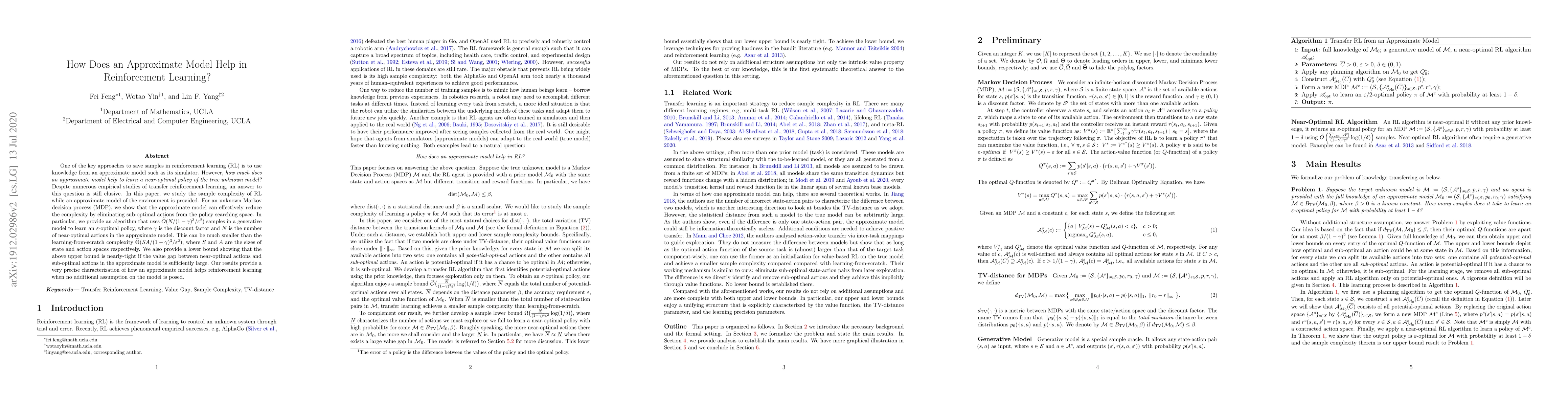 One of the key approaches to save samples in reinforcement learning (RL) is to use knowledge from an approximate model such as its simulator. However, how much does an approximate model help to learn a near-optimal policy of the true unknown model? Despite numerous empirical studies of transfer reinforcement learning, an answer to this question is still elusive. In this paper, we study the sample complexity of RL while an approximate model of the environment is provided. For an unknown Markov decision process (MDP), we show that the approximate model can effectively reduce the complexity by eliminating sub-optimal actions from the policy searching space. In particular, we provide an algorithm that uses $\widetilde{O}(N/(1-\gamma)^3/\varepsilon^2)$ samples in a generative model to learn an $\varepsilon$-optimal policy, where $\gamma$ is the discount factor and $N$ is the number of near-optimal actions in the approximate model. This can be much smaller than the learning-from-scratch complexity $\widetilde{\Theta}(SA/(1-\gamma)^3/\varepsilon^2)$, where $S$ and $A$ are the sizes of state and action spaces respectively. We also provide a lower bound showing that the above upper bound is nearly-tight if the value gap between near-optimal actions and sub-optimal actions in the approximate model is sufficiently large. Our results provide a very precise characterization of how an approximate model helps reinforcement learning when no additional assumption on the model is posed.