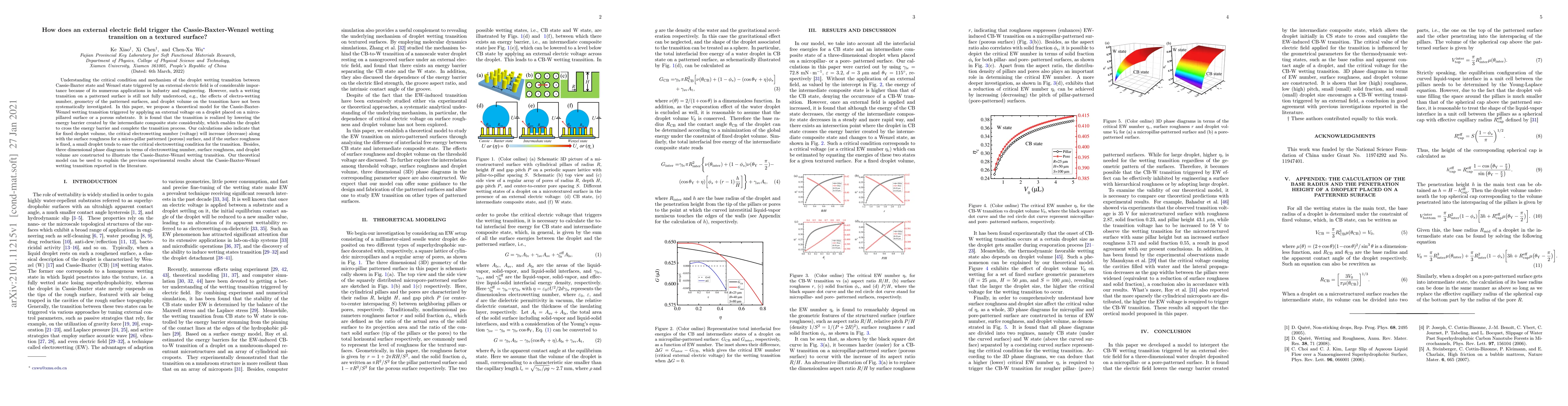 This paper proposes a theoretical model to understand how an external electric field induces the Cassie-Baxter to Wenzel wetting transition on textured surfaces. The model reveals that the transition is facilitated by lowering the energy barrier, and it provides insights into the effects of surface roughness, droplet volume, and electrowetting number on the transition process.