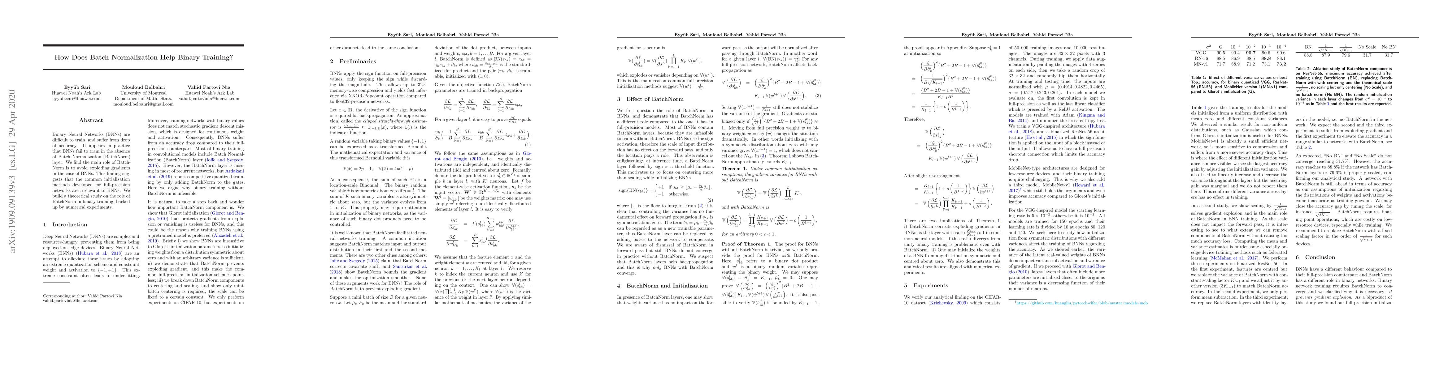 Batch Normalization helps binary neural networks train by preventing exploding gradients, making common initialization methods irrelevant. This finding suggests BatchNorm is essential for successful BNN training.