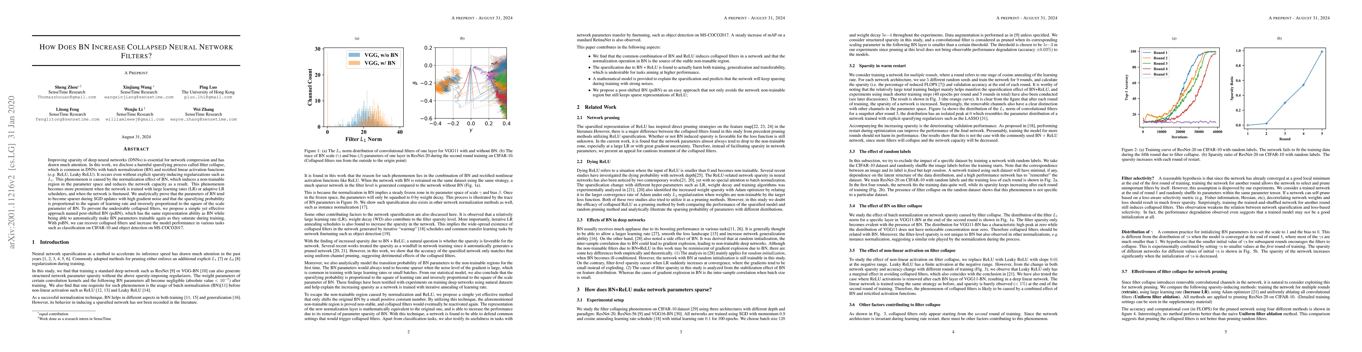 Improving sparsity of deep neural networks (DNNs) is essential for network compression and has drawn much attention. In this work, we disclose a harmful sparsifying process called filter collapse, which is common in DNNs with batch normalization (BN) and rectified linear activation functions (e.g. ReLU, Leaky ReLU). It occurs even without explicit sparsity-inducing regularizations such as $L_1$. This phenomenon is caused by the normalization effect of BN, which induces a non-trainable region in the parameter space and reduces the network capacity as a result. This phenomenon becomes more prominent when the network is trained with large learning rates (LR) or adaptive LR schedulers, and when the network is finetuned. We analytically prove that the parameters of BN tend to become sparser during SGD updates with high gradient noise and that the sparsifying probability is proportional to the square of learning rate and inversely proportional to the square of the scale parameter of BN. To prevent the undesirable collapsed filters, we propose a simple yet effective approach named post-shifted BN (psBN), which has the same representation ability as BN while being able to automatically make BN parameters trainable again as they saturate during training. With psBN, we can recover collapsed filters and increase the model performance in various tasks such as classification on CIFAR-10 and object detection on MS-COCO2017.
