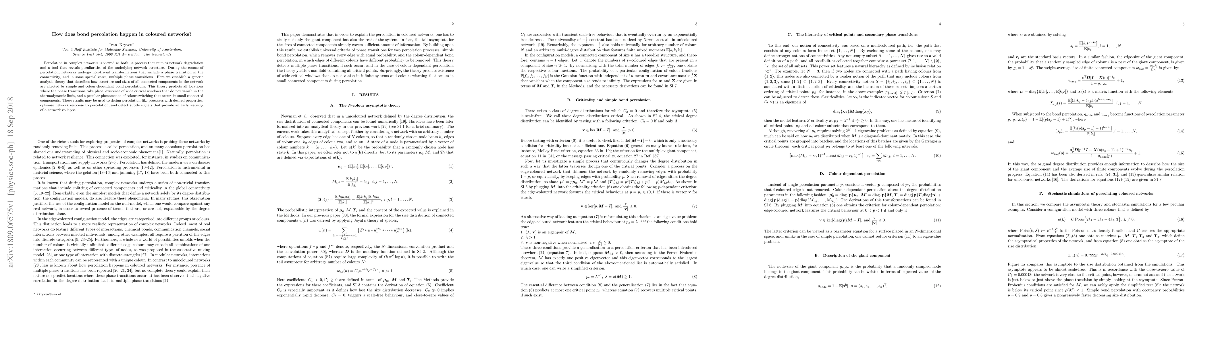 This paper develops an analytic theory for bond percolation in coloured networks, predicting phase transitions, critical windows, and colour switching in connected components, which can aid in designing and optimizing network resilience.