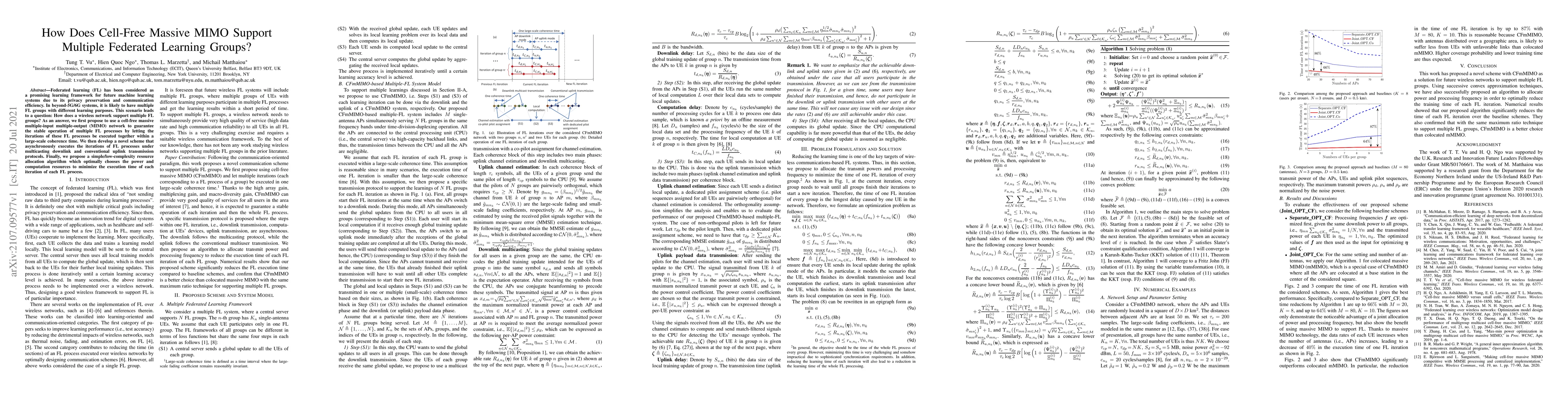 This paper explores how cell-free massive MIMO networks can support multiple federated learning groups by proposing a scheme that allows asynchronous execution of FL iterations under multicasting and conventional uplink protocols, along with a low-complexity resource allocation algorithm to minimize iteration execution time.