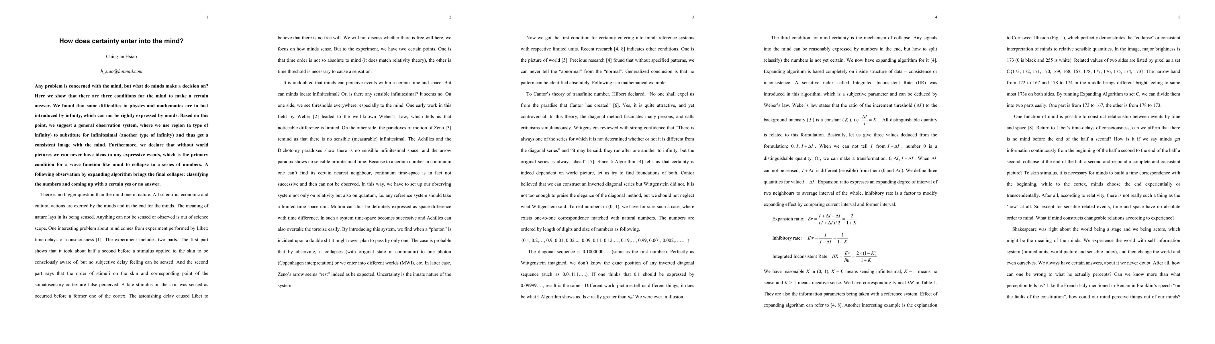 This paper explores how certainty is processed in the mind, proposing that three conditions enable it. It argues that infinity in physics and mathematics creates decision-making challenges, suggesting a new observation system using regions to replace infinitesimals for consistency. The mind requires world pictures to form ideas, leading to a final collapse into a definitive yes or no answer through classification.