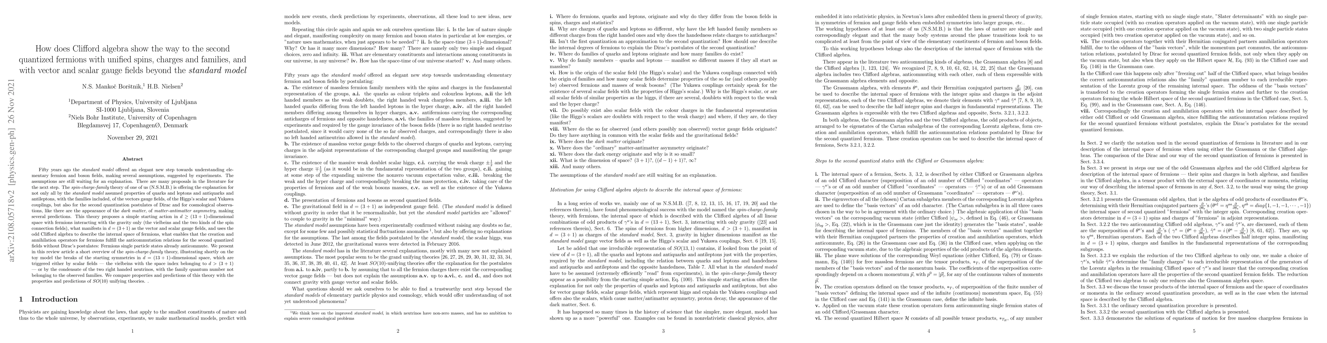Fifty years ago the standard model offered an elegant new step towards understanding elementary fermion and boson fields, making several assumptions, suggested by experiments. The assumptions are still waiting for an explanation. There are many proposals in the literature for the next step. The spin-charge-family theory of one of us (N.S.M.B.) is offering the explanation for not only all by the standard model assumed properties of quarks and leptons and antiquarks and antileptons, with the families included, of the vectors gauge fields, of the Higgs's scalar and Yukawa couplings, but also for the second quantization postulates of Dirac and for cosmological observations, like there are the appearance of the dark matter, of matter-antimatter asymmetry, making several predictions. This theory proposes a simple starting action in $ d\ge (13+1)$ space with fermions interacting with the gravity only, what manifests in $d=(3+1)$ as the vector and scalar gauge fields, and uses the odd Clifford algebra objects to describe the internal space of fermions, what enables that the creation and annihilation operators for fermions fulfill the anticommutation relations for the second quantized fields without Dirac's postulates: Fermions single particle states already anticommute. We present in this review article a short overview of the spin-charge-family theory, illustrating shortly on the toy model the breaks of the starting symmetries in $d=(13+1)$ space, which are triggered either by scalar fields -- the vielbeins with the space index belonging to $d>(3+1)$ -- or by the condensate of the two right handed neutrinos, with the family quantum number not belonging to the observed families. We compare properties and predictions of this theory with the properties and predictions of $SO(10)$ unifying theories.