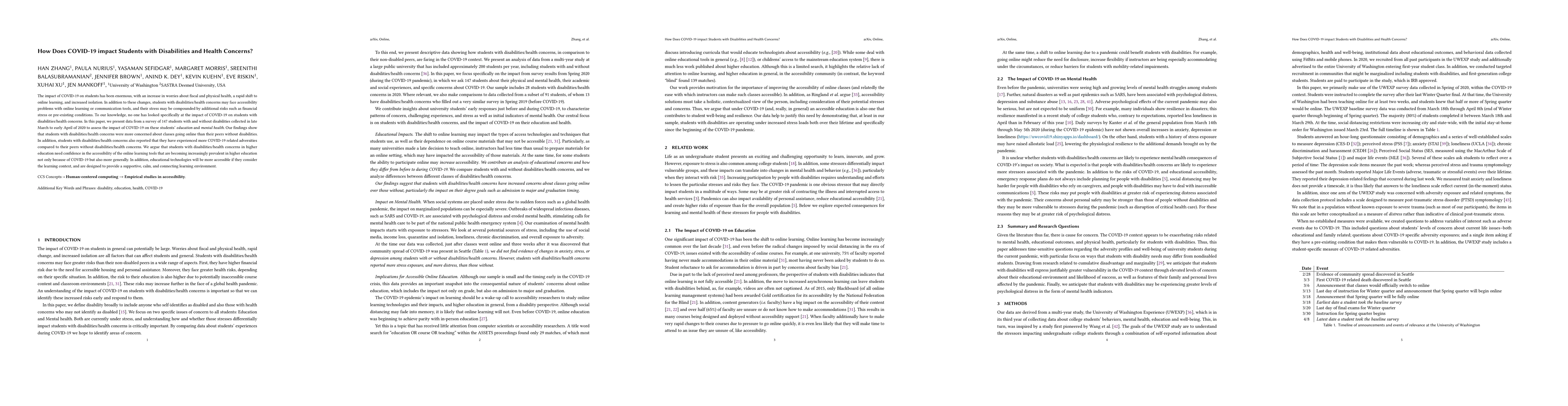 This paper examines the heightened impact of COVID-19 on students with disabilities/health concerns, revealing greater concerns about online learning accessibility and more reported adversities compared to their peers. It emphasizes the need for accessible educational technologies to support these students' mental health and educational continuity.