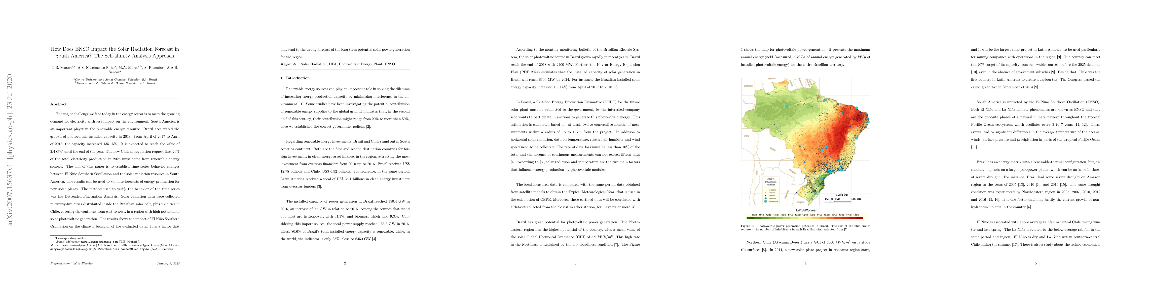 This paper investigates the influence of El Niño Southern Oscillation (ENSO) on solar radiation forecasts in South America using Detrended Fluctuation Analysis. Findings reveal that ENSO significantly affects the climatic behavior of solar radiation, potentially leading to inaccurate long-term solar power generation forecasts.